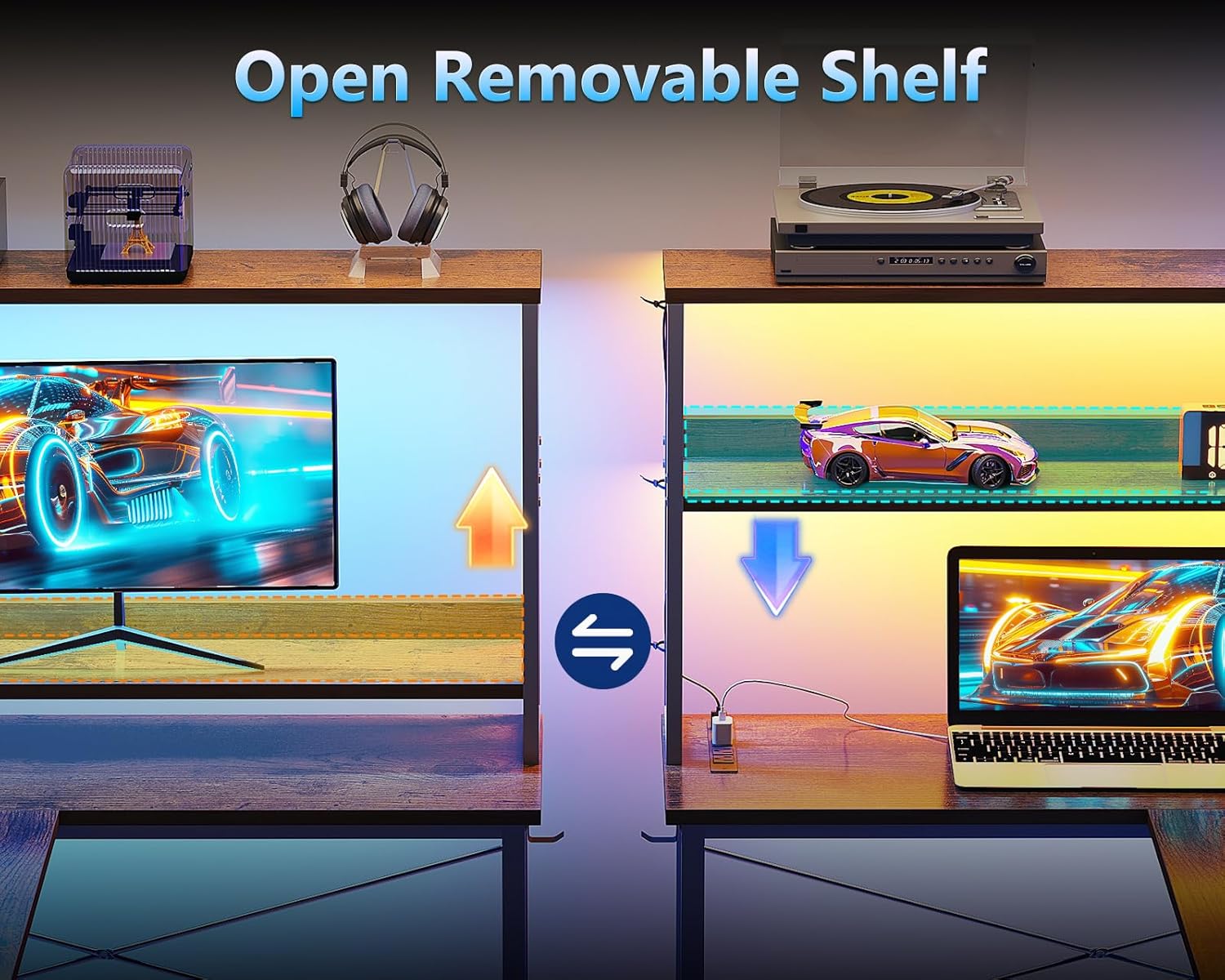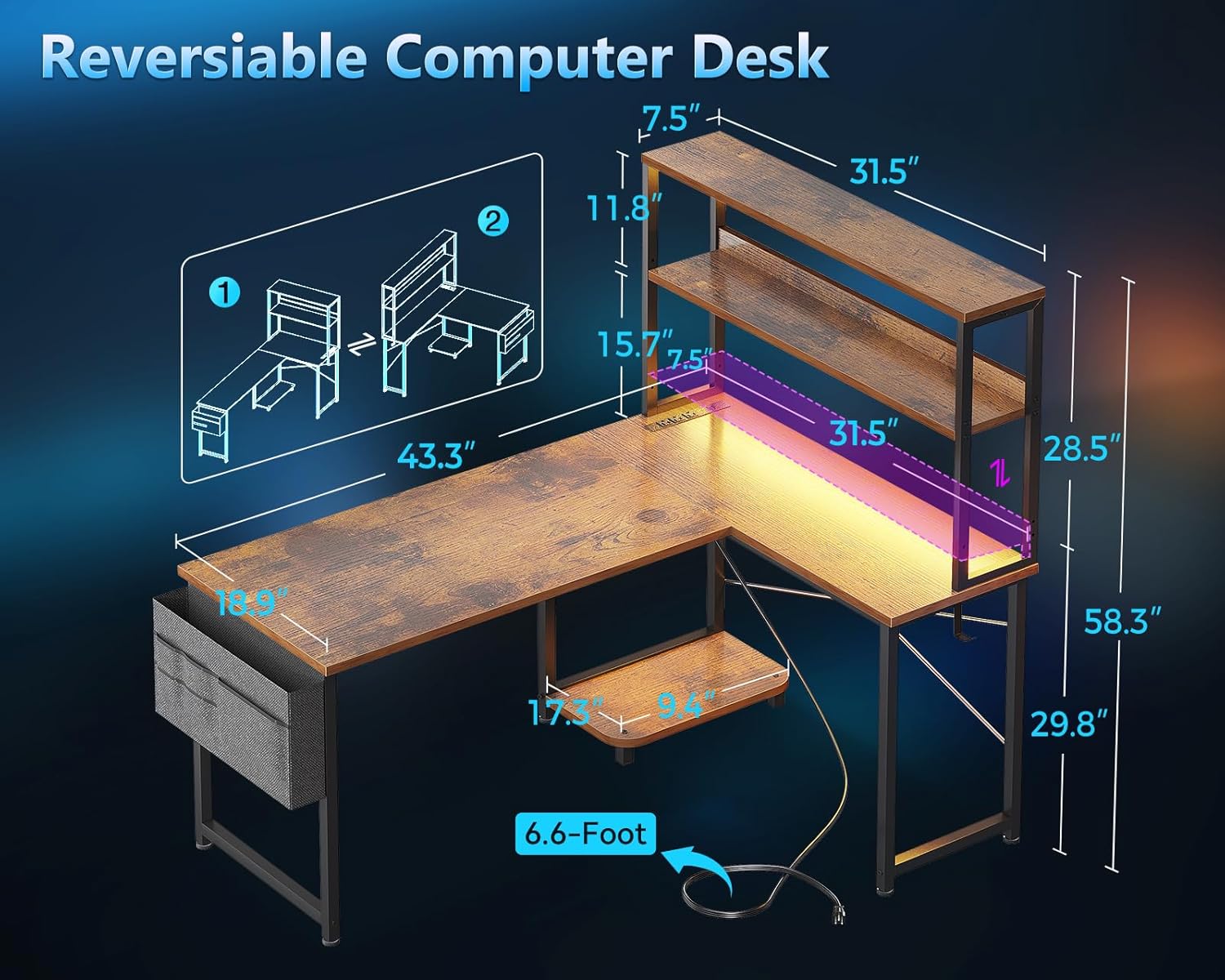 Casaottima Gaming Desk with Power Outlets & LED Lights, 43 Inch Reversible L Shaped Computer Desk with Shelves & Storage Bag, Corner Desk for Home Office, Vintage