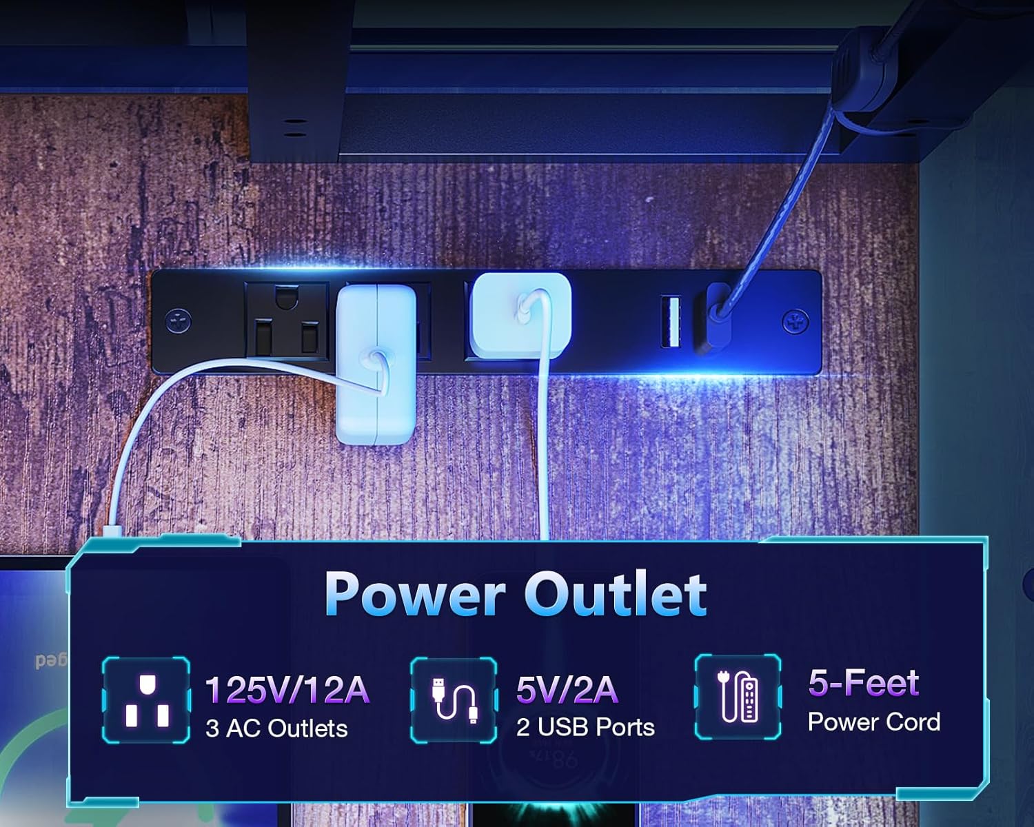 - 【Built-In Charging Station with Extended Reach】Equipped with 3 AC outlets and 2 USB ports, the desk centralizes power access for laptops, consoles, and devices. The 6.6ft cord allows flexible placement and effective cable management to keep your desktop neat and organized.