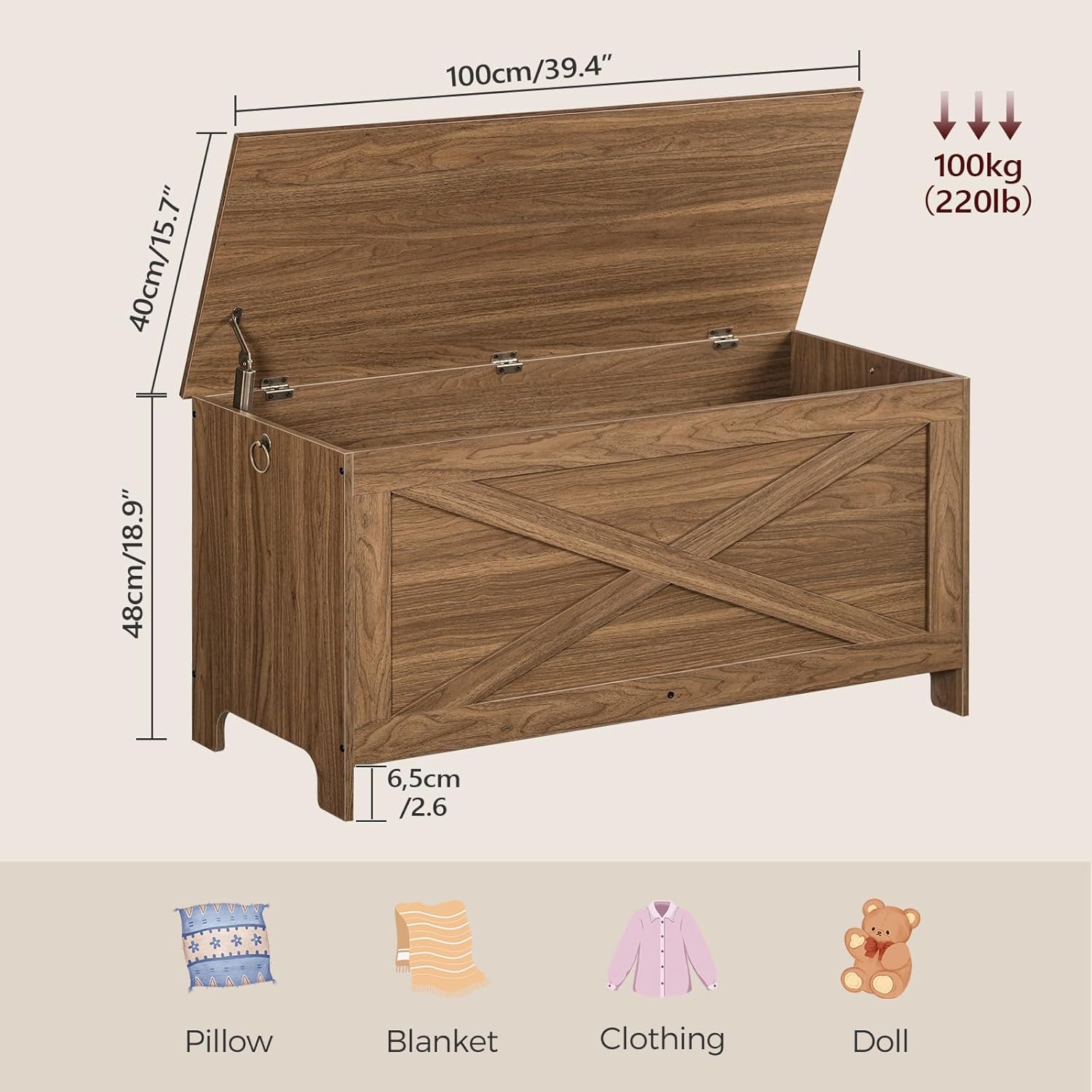 - What Can I Put In The Toy Chest? The dimensions are 15.7"D x 39.4"W x 18.9"H. Flip over the top to reveal a spacious compartment. It provides extra storage for blankets, pillows, books and anything else you want to hide; safety hinges keep lid in place when you seeks for something inside