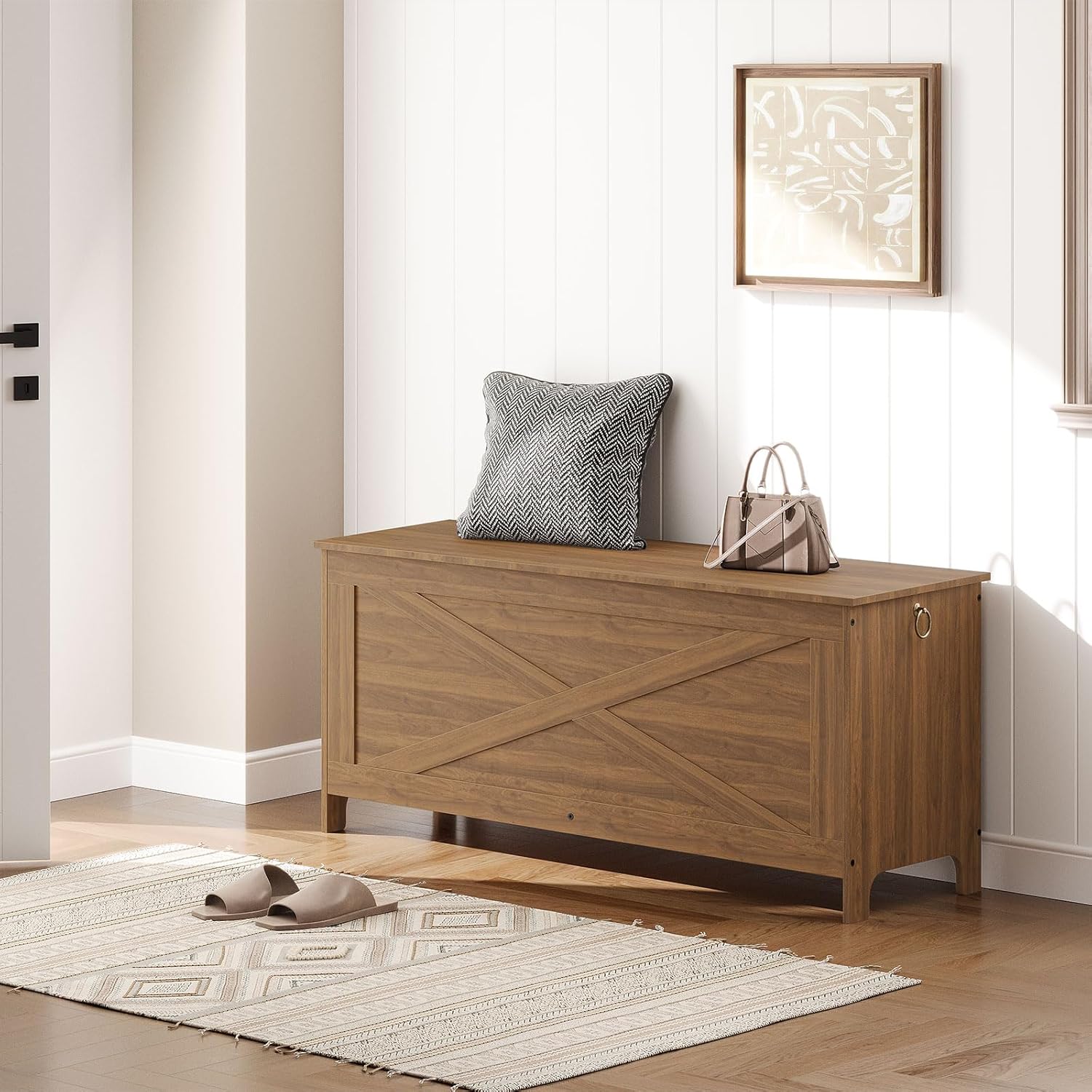 - High-End Aesthetics: The sophisticated barn door design is paired with brown-color panels for a modern minimalist vibe, making this storage bench suitable for any home decor, adding an international flavor to every living room