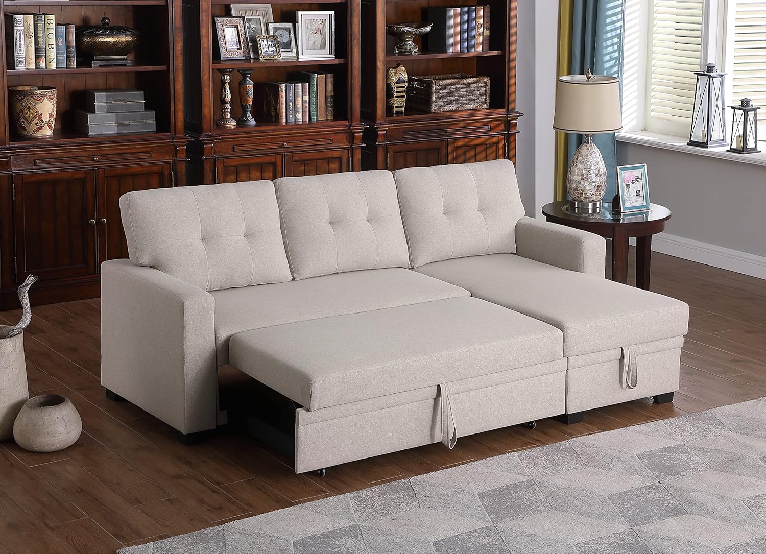 - Agnes sleeper sofa L shaped couch can not only be used as a sofa for normal sitting, but also has a chaise couch design on the side for you to lie down and rest. What's more, the pull-out bed mechanism is designed to quickly and easily convert from a sofa to a double bed for you to sleep on.