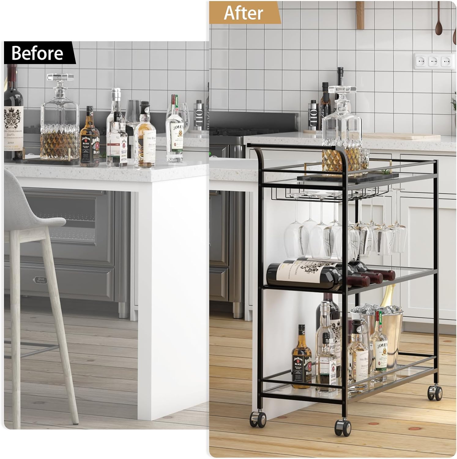 - [Large Capacity]: This home bar serving cart features 3 spacious shelves, providing you with plenty of secure space to craft delicious drinks and serve tasty snacks. The rolling bar cart also comes with wine glass holder and wine rack to display your favorite wines and glasses, ensuring ample capacity to meet your needs. Size: 31.5”L x 13”W x 37”H (with handle).