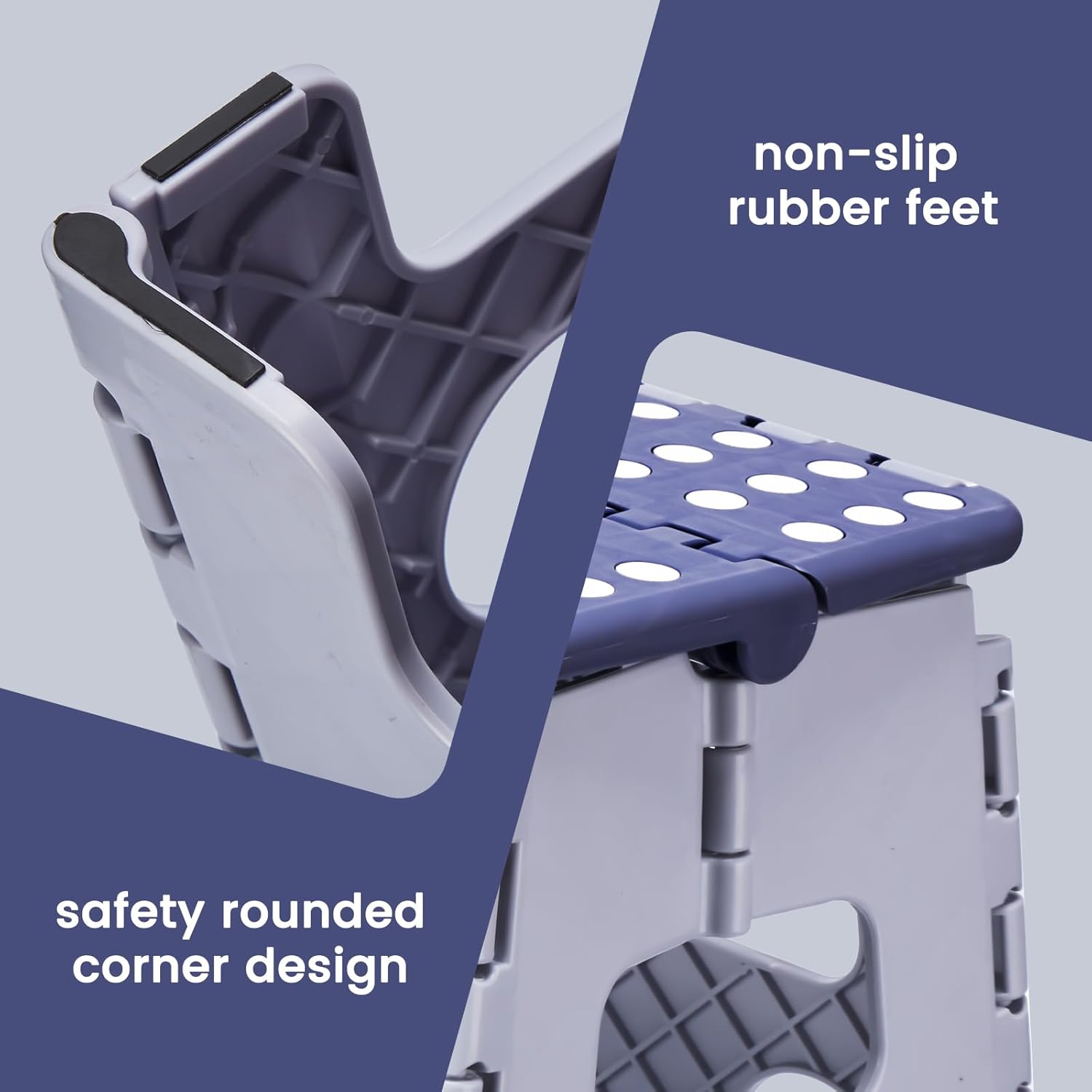 - Safe For Kids and adult : Rubber foot grips, non-slip surface and round edges, support excellent traction for the collapsible folding step stool; ensure your safety by preventing unwanted slips