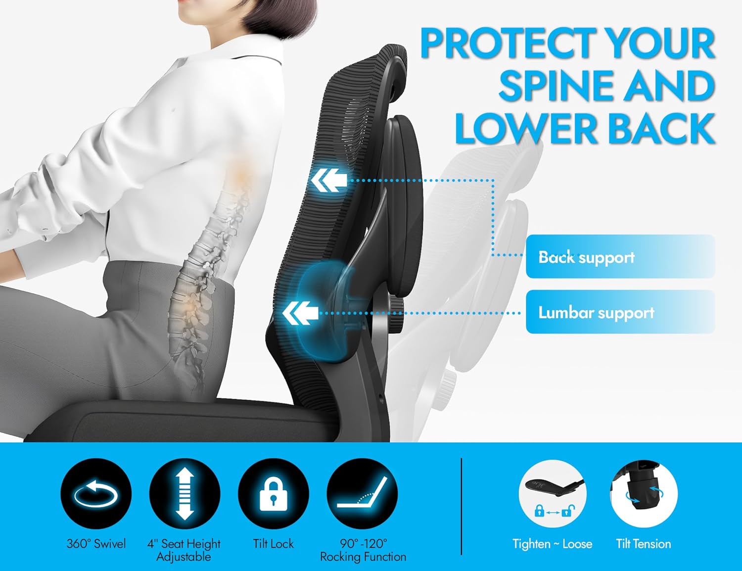 - Comfortable Breathable Mesh Seat: This office chair offers a spacious seating area, accommodating various body types. Overall dimensions (including arms): 25.7" W x 17.3" D x 46.9.3"-49.2" H, Seat dimensions: 20" W x 17.3" D x 18.5"-3" H. It can support up to 330 lbs. Its unique recline function allows you to tilt the backrest (90~120°) or sit upright freely, ensuring your comfort and relaxation
