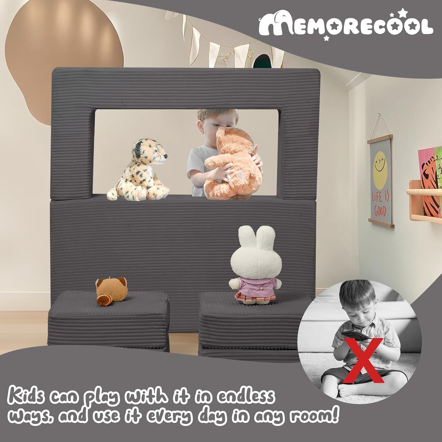 MeMoreCool Modular Kids Couch, Corduroy Play Toddler Couch for Bedroom Playroom Furniture, Convertible Foam Kids Sofa Bed, Fold Out Baby Sofa for Girl Boy, Dark Grey