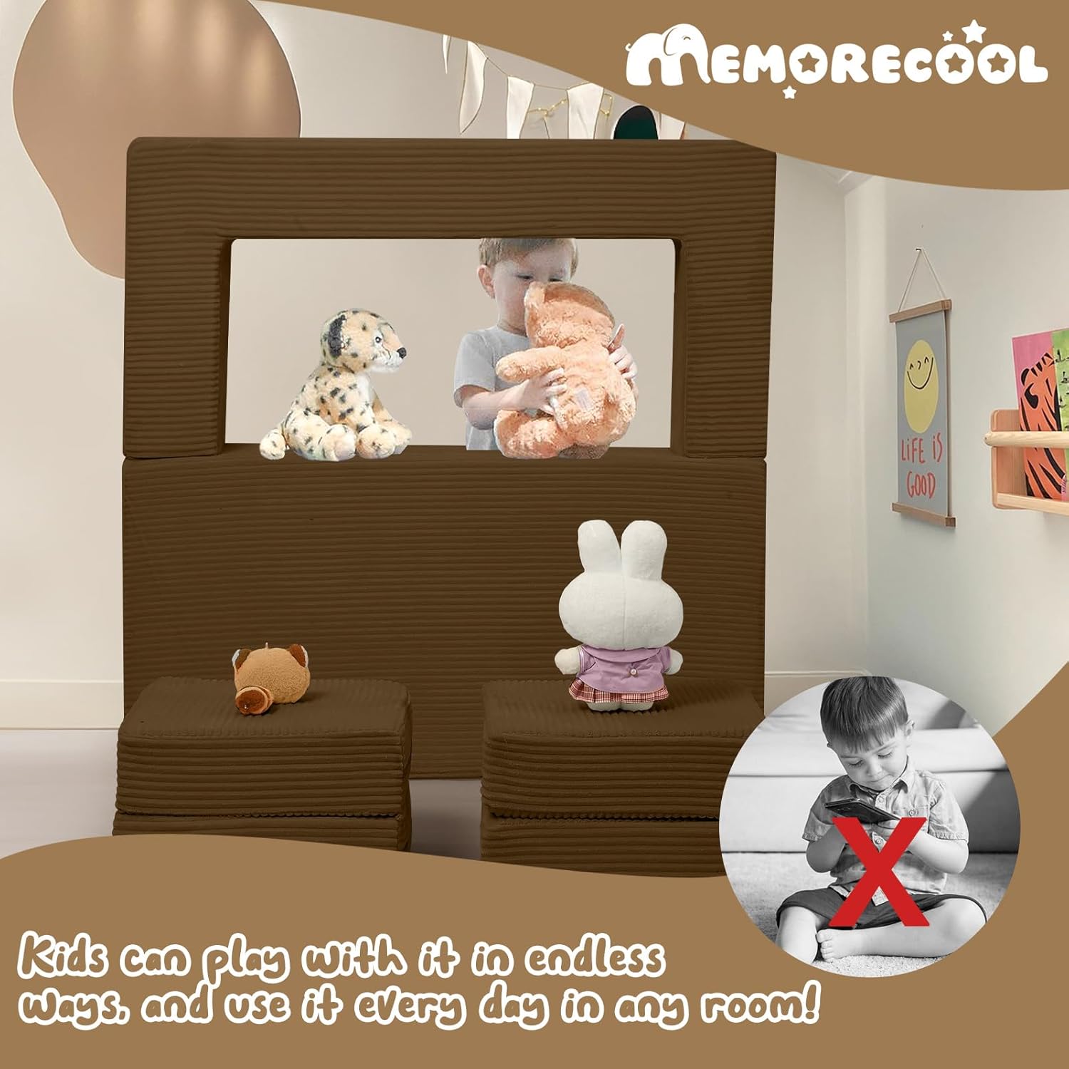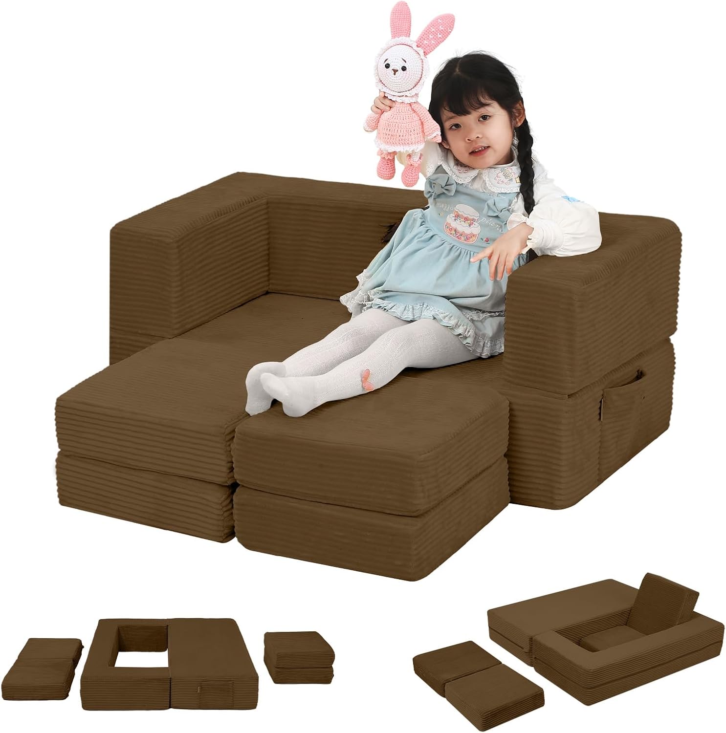 MeMoreCool Modular Kids Couch, Corduroy Play Toddler Couch for Bedroom Playroom Furniture, Convertible Foam Kids Sofa Bed, Fold Out Baby Sofa for Girl Boy, Brown
