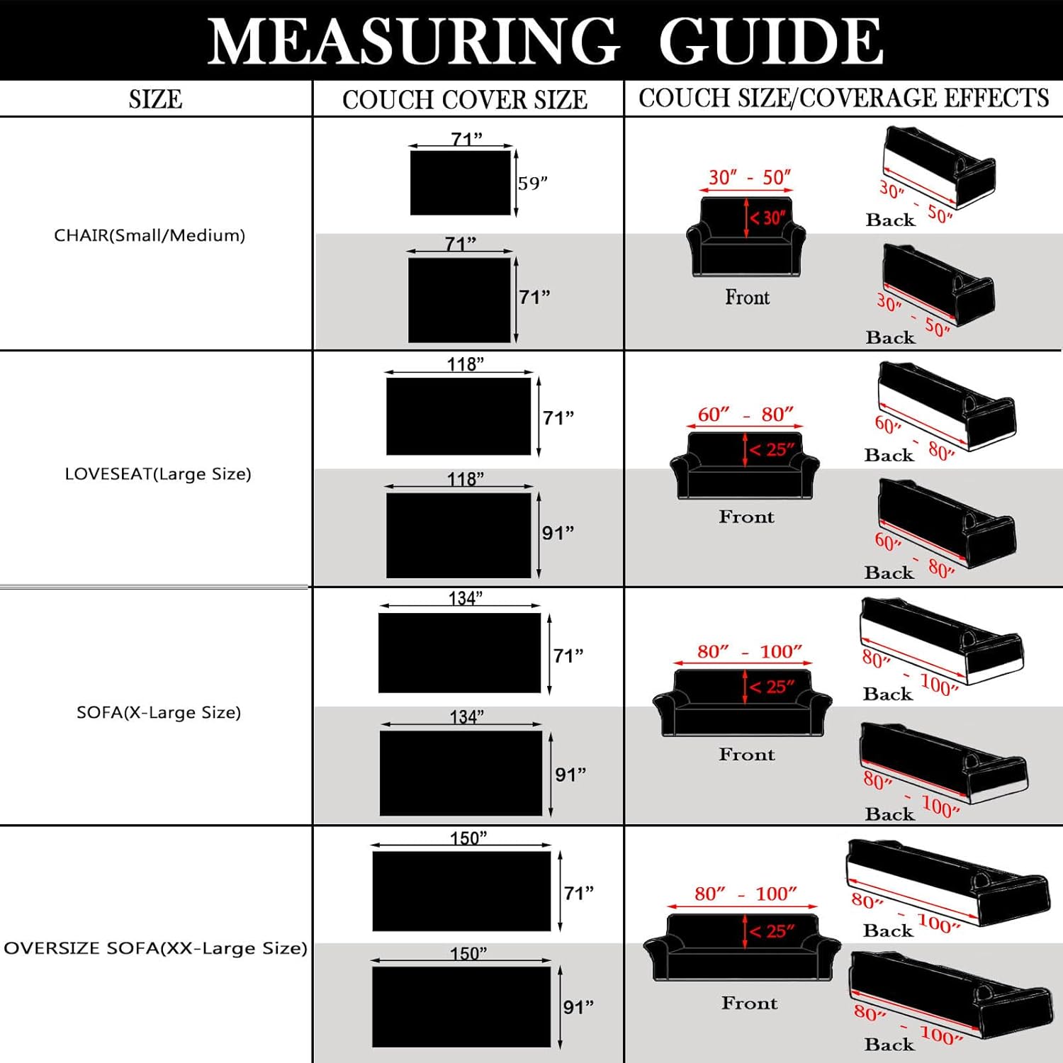 - HOW TO CHOOSE: Please measure your furniture before you buy. We recommend Medium Size 71"x 71"for chair/recliner; X-Medium Size 71"x 102"for Large chair/recliner; Large Size 71"or 91"x 118 " for loveseat; X-Large Size 71"or 91" x 134" for sofas; XX-Large Size 71"or 91" x 150" for oversize sofas; Suitable for most couch, Provide perfect coverage for the sofa (including armrests)