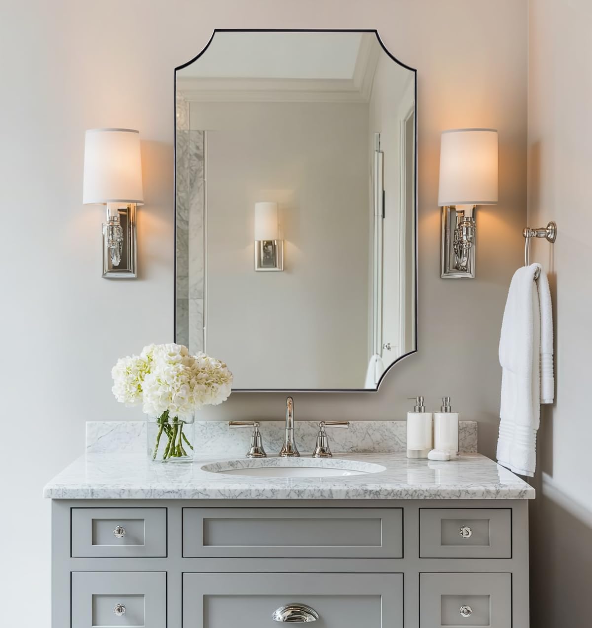 - 【Premium Stainless Steel Craftsmanship】: (N.W: 23.1LBS). Crafted from stainless steel metal with oxidation-resistant properties, this chrome scalloped mirror for bathroom offers enhanced stability and a longer lifespan