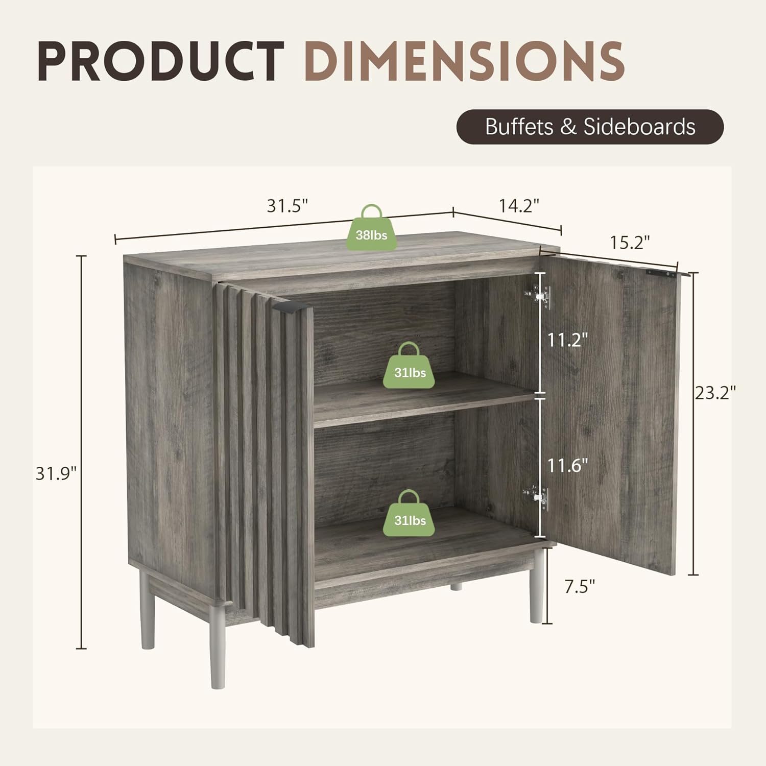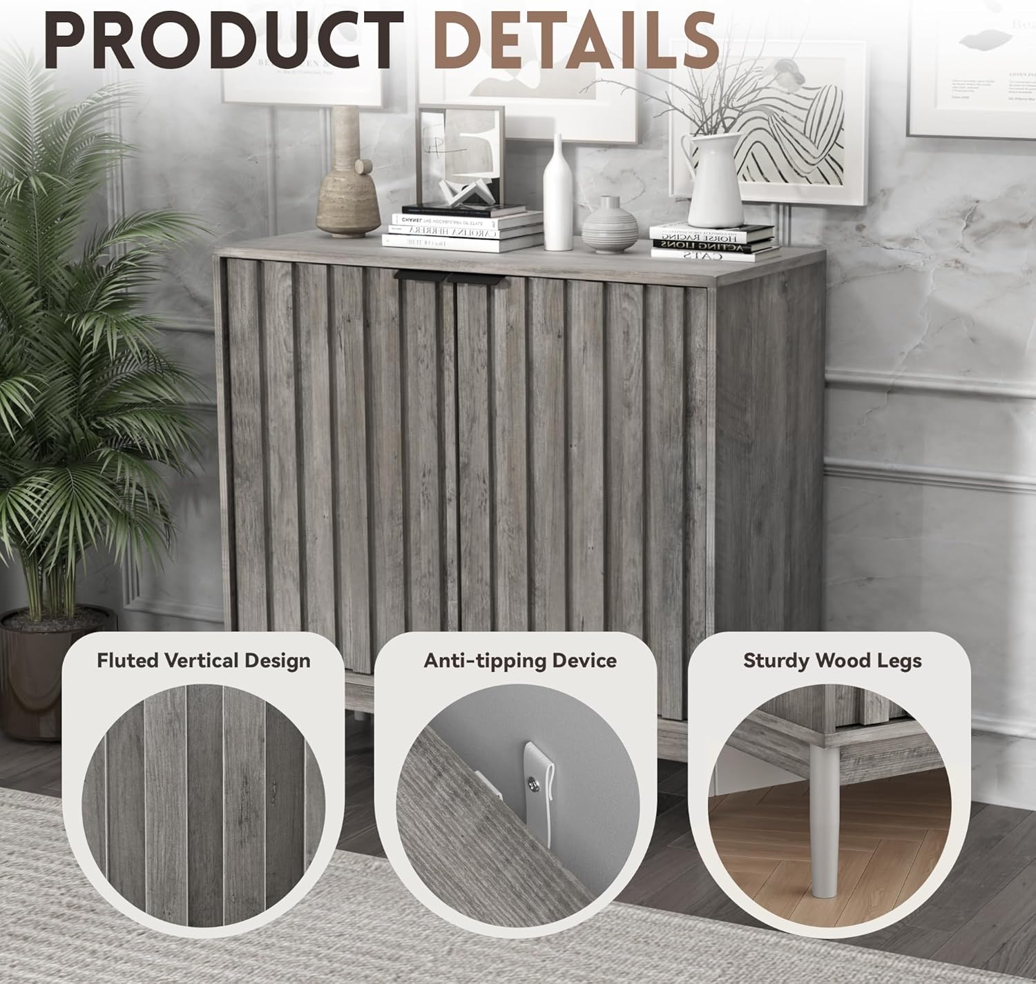 Fluted Cabinet with Storage, Small Buffet Cabinet Sideborad with Door, Kitchen Buffet Storage Accent Cabinets with Adjustable Shelves for Living Room, Entry, Hallway, Gray