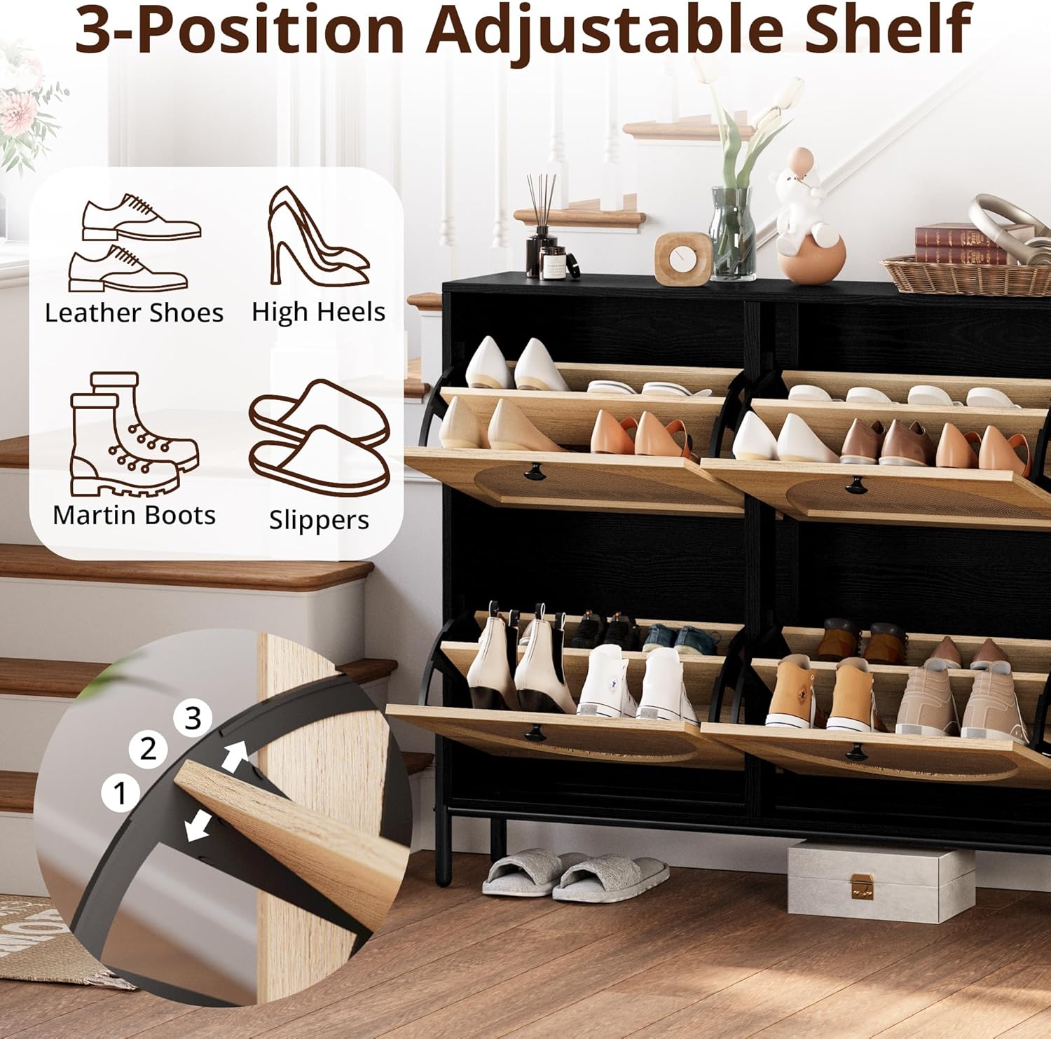 - Durable and Safe Construction: This entryway shoe cabinet is made of sturdy MDF wood and metal leg base to ensure excellent weight capacity, while the anti-tip mechanism and rounded handles increase safety and prevent scratches during use