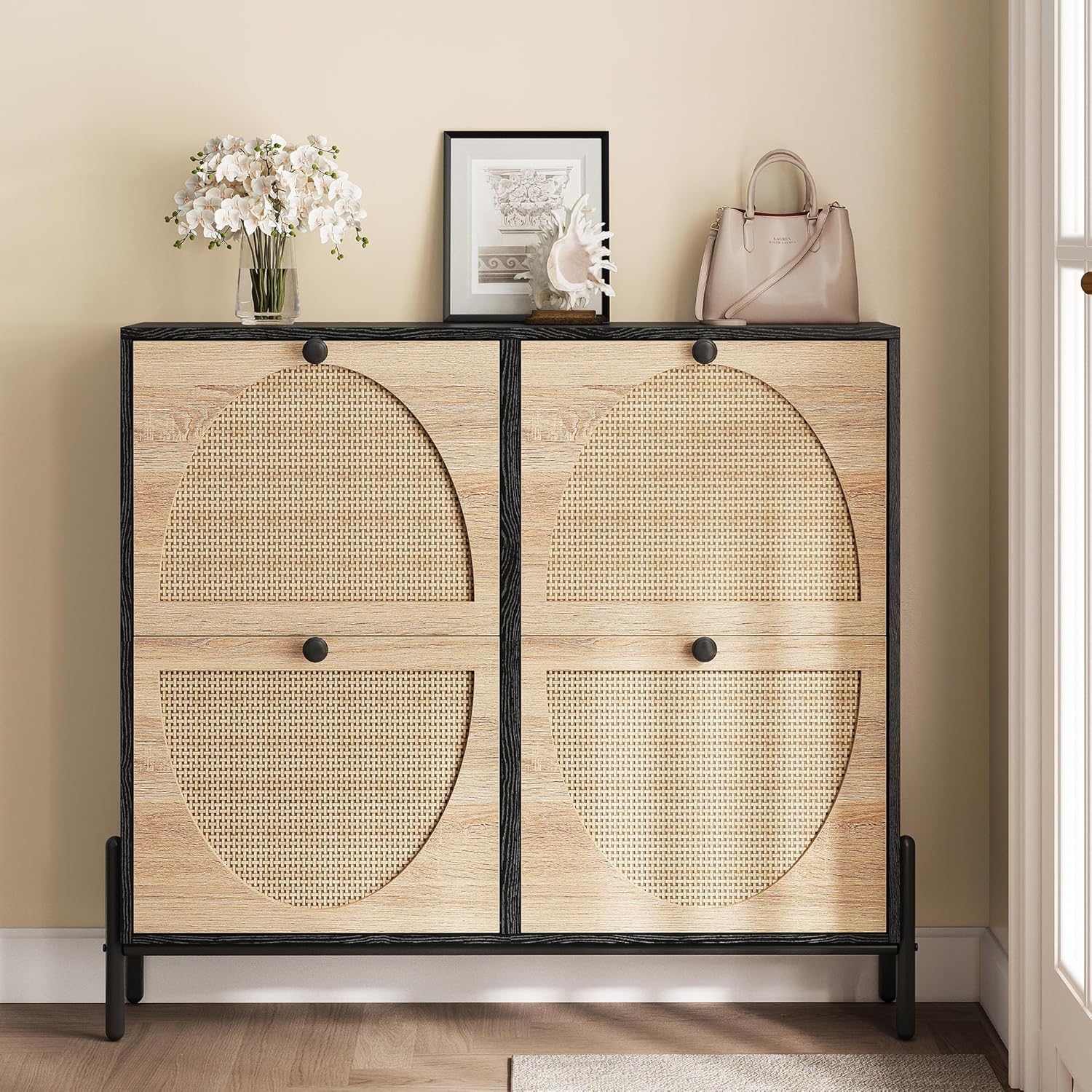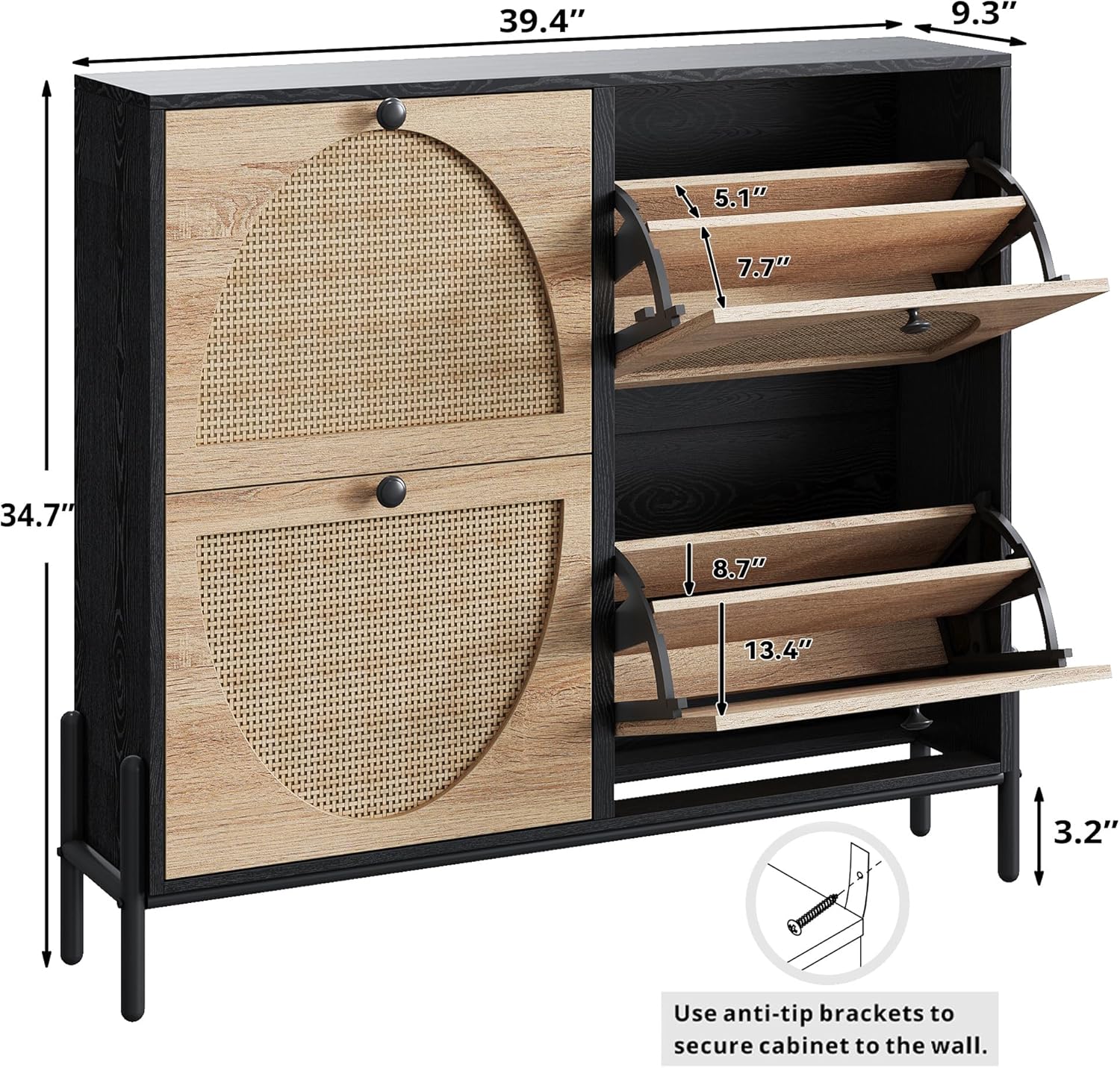IRONCK Rattan Shoe Cabinet Storage with 4 Flip Drawers, Freestanding Shoe Storage Organizer Cabinet for Entryway, Narrow Shoe Rack Cabinet, Black