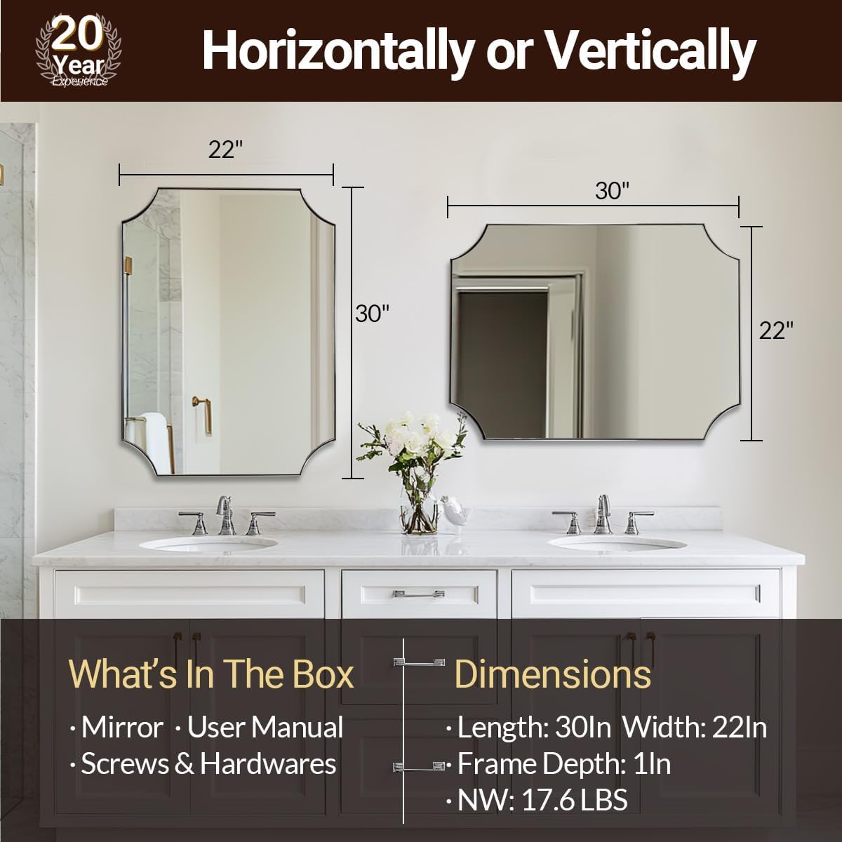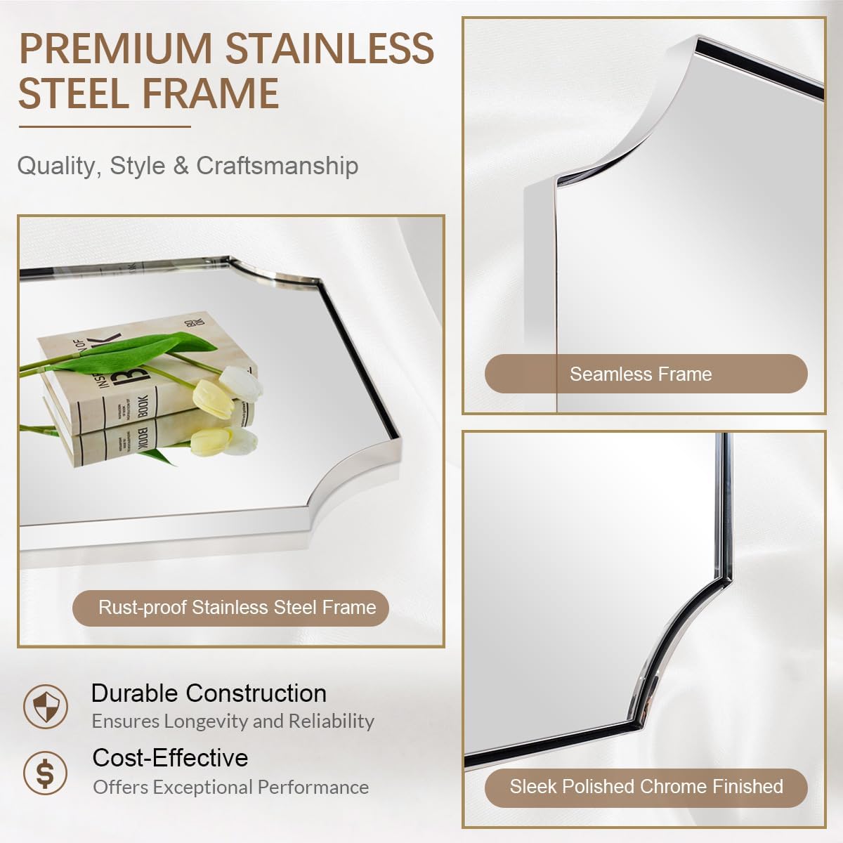 - 【Premium Stainless Steel Craftsmanship】: (N.W: 17.6LBS). Crafted from stainless steel metal with oxidation-resistant properties, this chrome scalloped mirror for bathroom offers enhanced stability and a longer lifespan