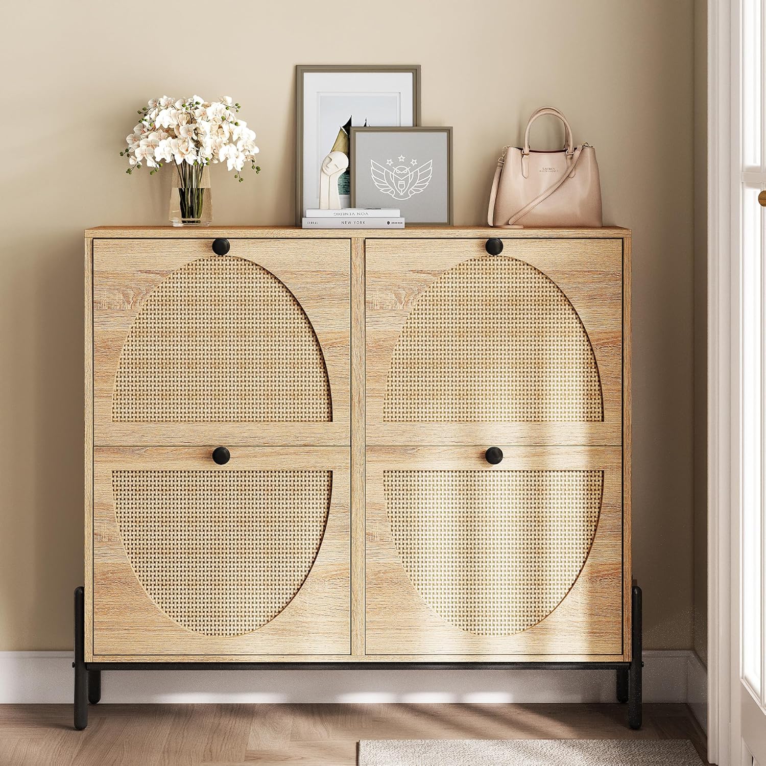 IRONCK Rattan Shoe Cabinet Storage with 4 Flip Drawers, Freestanding Shoe Storage Organizer Cabinet for Entryway, Narrow Shoe Rack Cabinet, Oak