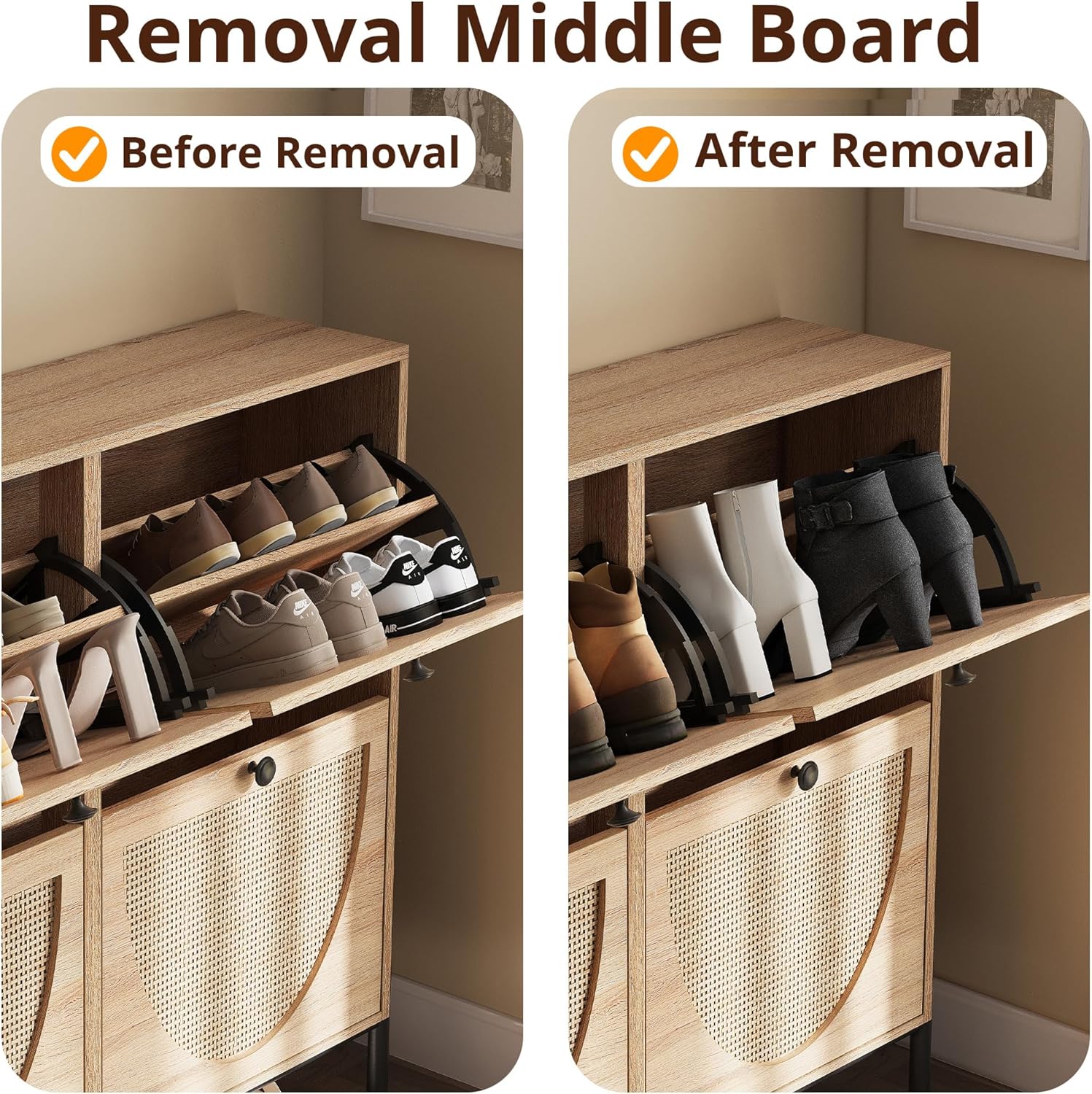 - Space Saving Flip-top Design: The freestanding shoe cabinet is designed with flip-flop drawers that are easy to open and close, keeping your shoes away from dust. In addition, without removing the dividers, the flap drawer can hold men's shoes up to 11.5 inches
