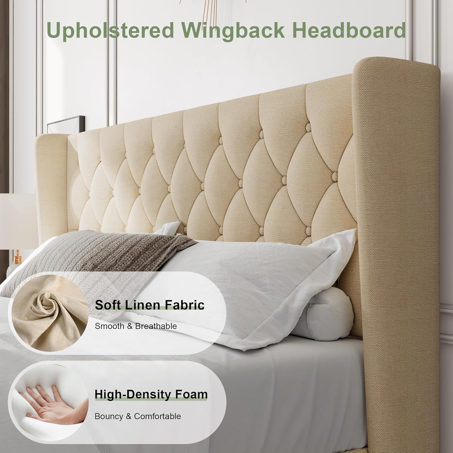 Feonase King Size Bed Frame with Wingback Tufted Headboard, Upholstered Platform Bed Frame with Heavy Duty Wooden Slats Support, Noise-Free, No Box Spring Needed, Easy Assembly, Beige