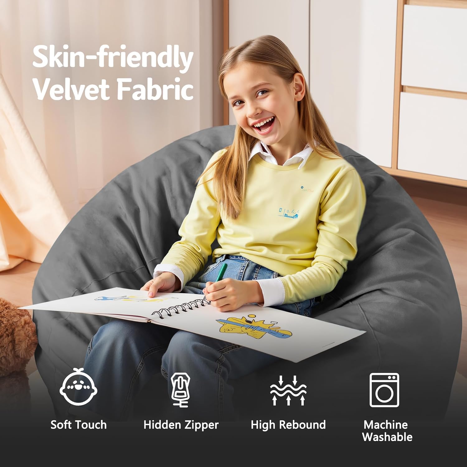 - Removable and Washable Cover: The cover of bean bag chair is removable and washable for further care. It is made of breathable premium dutch velvet with fine texture, soft and skin-friendly from touching. It is also anti-pilling and not easy to fade. You can easily put the beanbag cover into washer to clean it like new. Moreover its double stitched seams and hidden double-pull zipper ensures for super durability & strength.