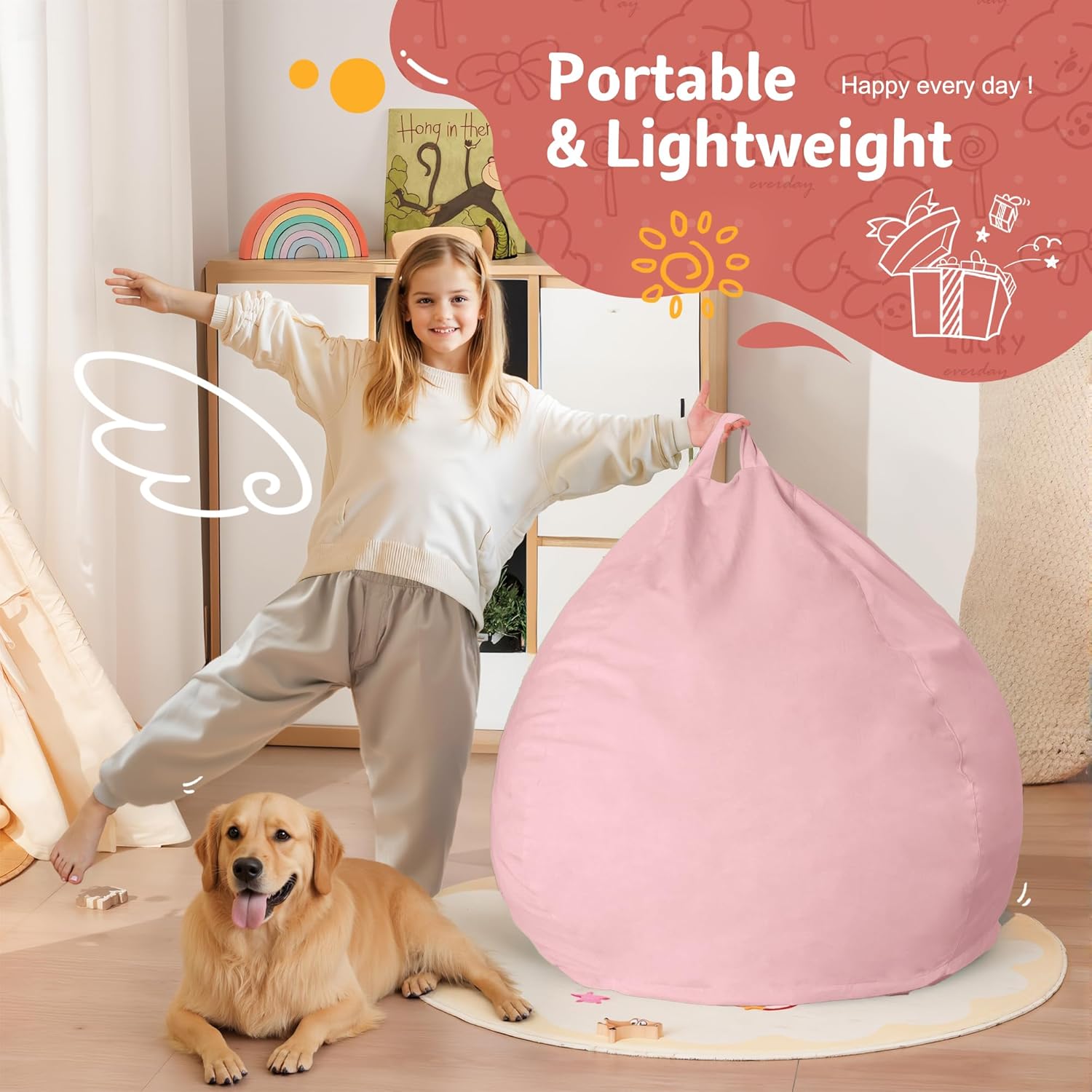 - Approximate Size: The comfy bean bag chair has small size for your little one. They can enjoy a comfortable place to sit! This bean bag chair is a great fit for a variety of living spaces with the "classic" bean bag shape everyone loves! Designed with a convenient handle makes it easy for little hands to travel to their next adventure.