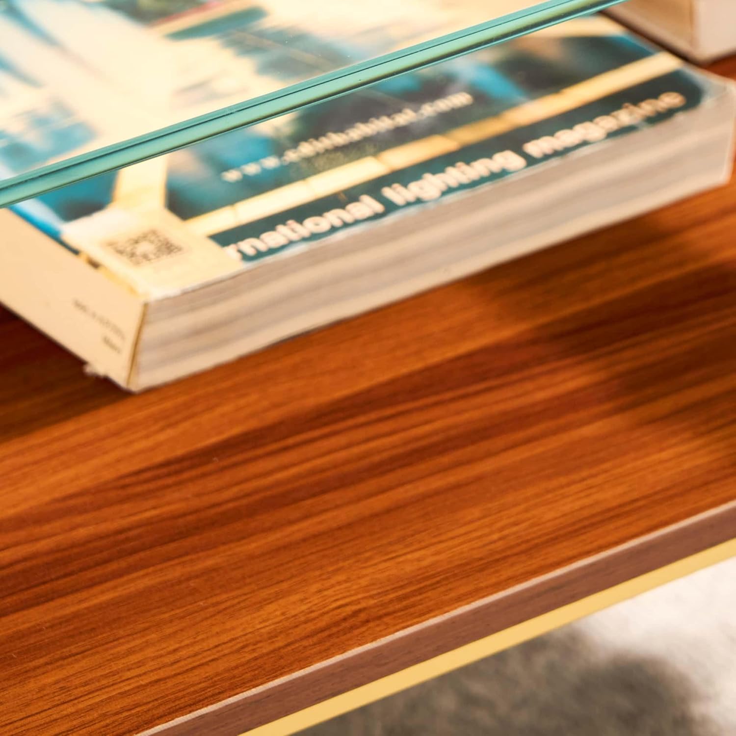 AGV LIGHTING Tadio Large Glass Coffee Table, Mid-Century Modern Coffee Table for Living Room, Gold Finish Leg, Clear Glass Top & Walnut Brown Shelf, 47 in Rrounded Corners