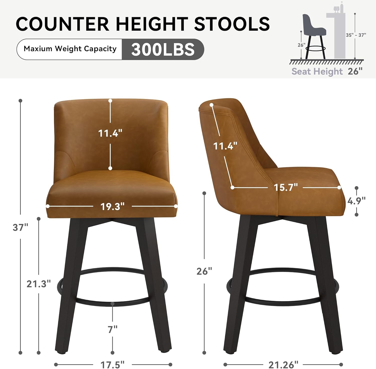 Counter Height Swivel Bar Stools Set of 6, 26 Inch Bar Stools with Footrest, Faux Leather Upholstered Barstools with Back and Solid Wood Legs for Kitchen Island, Dining Room,Pub,Brown