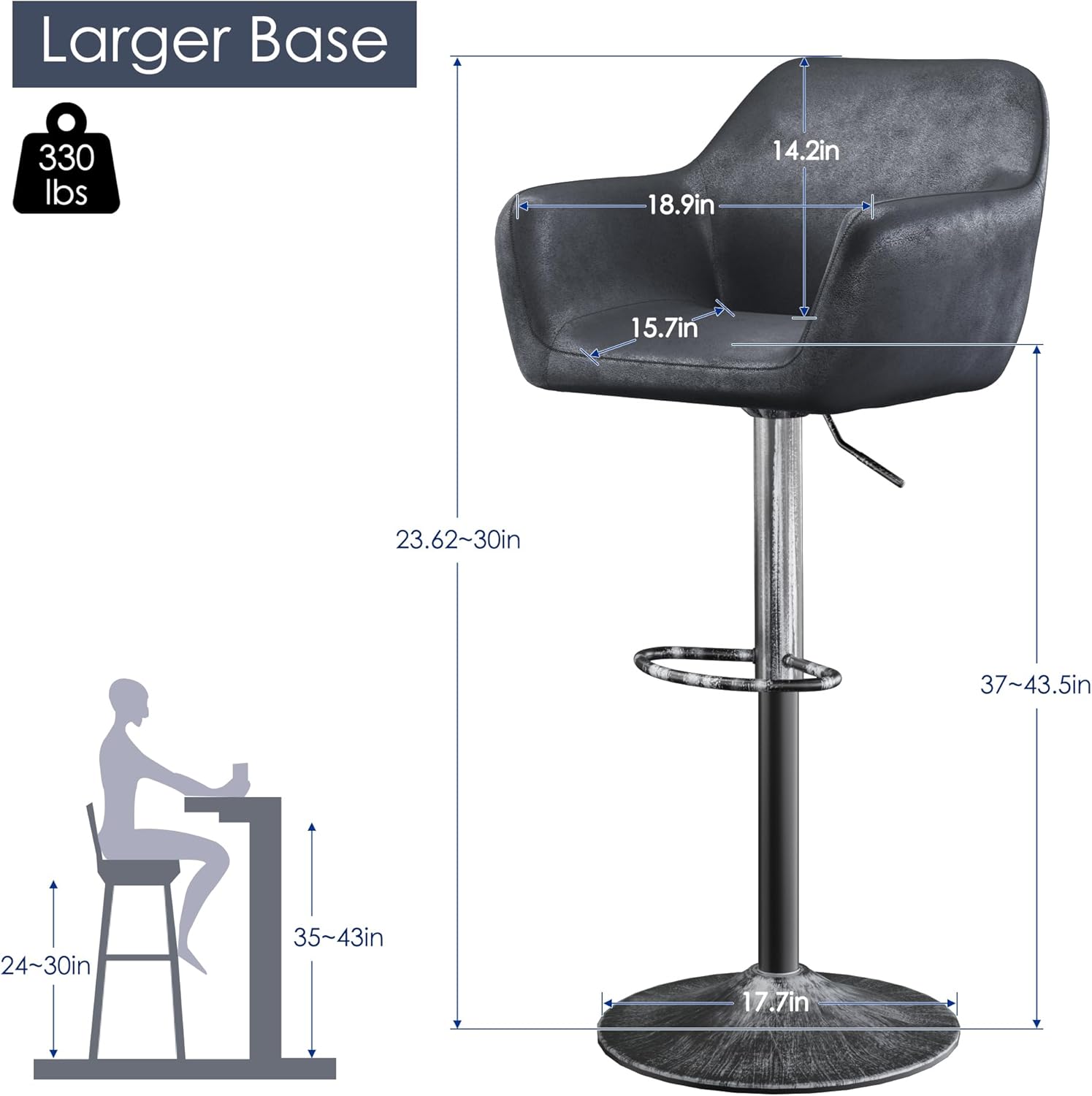 - Wide Silver Base: Constructed of metal frame and with 17.7 inch large base, the bar stools provides greater stability and sturdiness. It can accommodate up to 330 lbs. Scratch-resistant and non-slip rubber ring attached under the base not only prevents your floor from scratching, but also prevents harsh sounds when you move the bar chair.