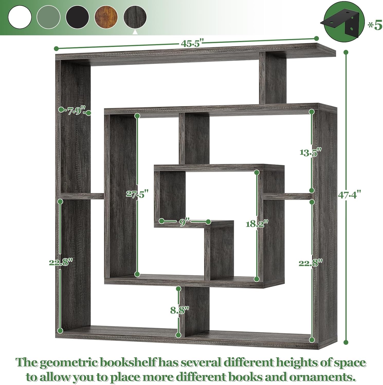 - Geometric Look Display Shelf - The grey oak book shelf showcases a striking geometric shape, adding a great architectural addition and modern statement to your room. The geometric style is very unique and adds chic elegance to the space, which will be the focal point. The variety of shelf heights allows for different ornaments sizes.