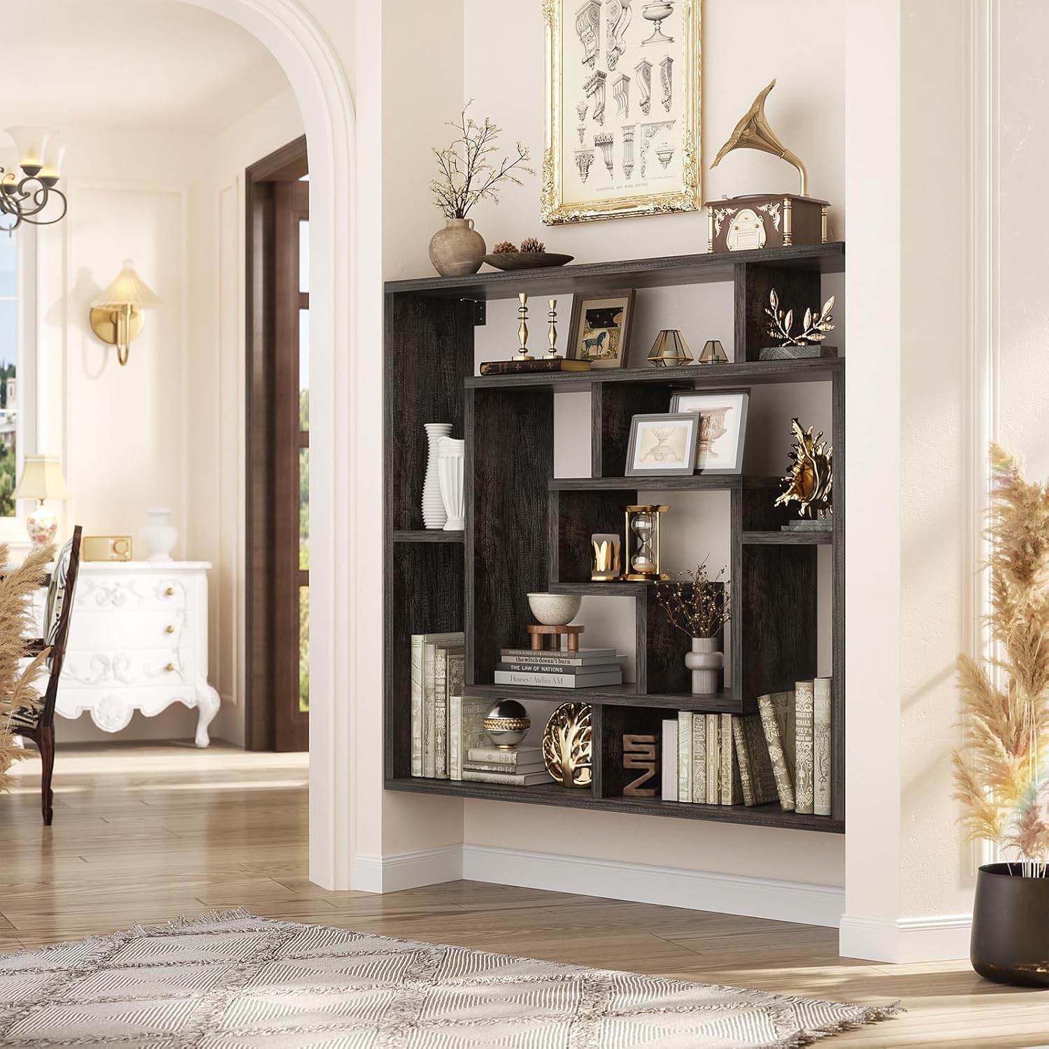 armocity 6 Tier Display Book Shelf Wall Mounted Bookshelf Freestanding Geometric Bookcase Floating Book Shelves for Wall Bedroom Living Room Home Office, 45.5"(W) * 47"(H), Grey Oak