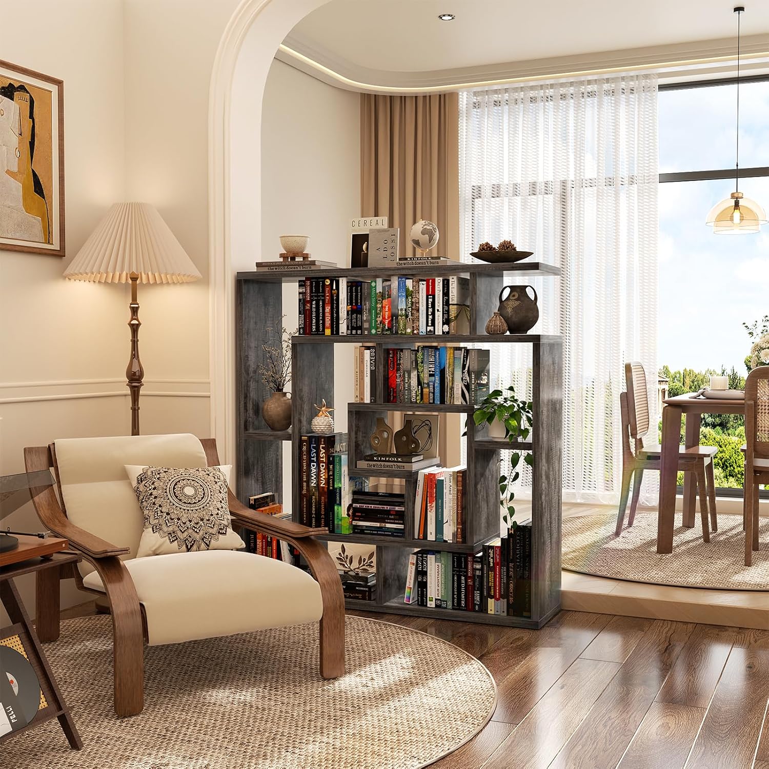 - Versatile Freestanding Bookshelf - This geometric bookshelf adds so much character but takes up minimal space. It's narrow and has a suitable height for a room divider in your home or office, allowing you to display books and all sorts of knick-knacks with an artistic flair. Besides, it's a fun bookcase for kids area, which doesn't eat the room. Adds a lot of style to a blank wall. You can also add it to your foyer space as a piece of entryway furniture.