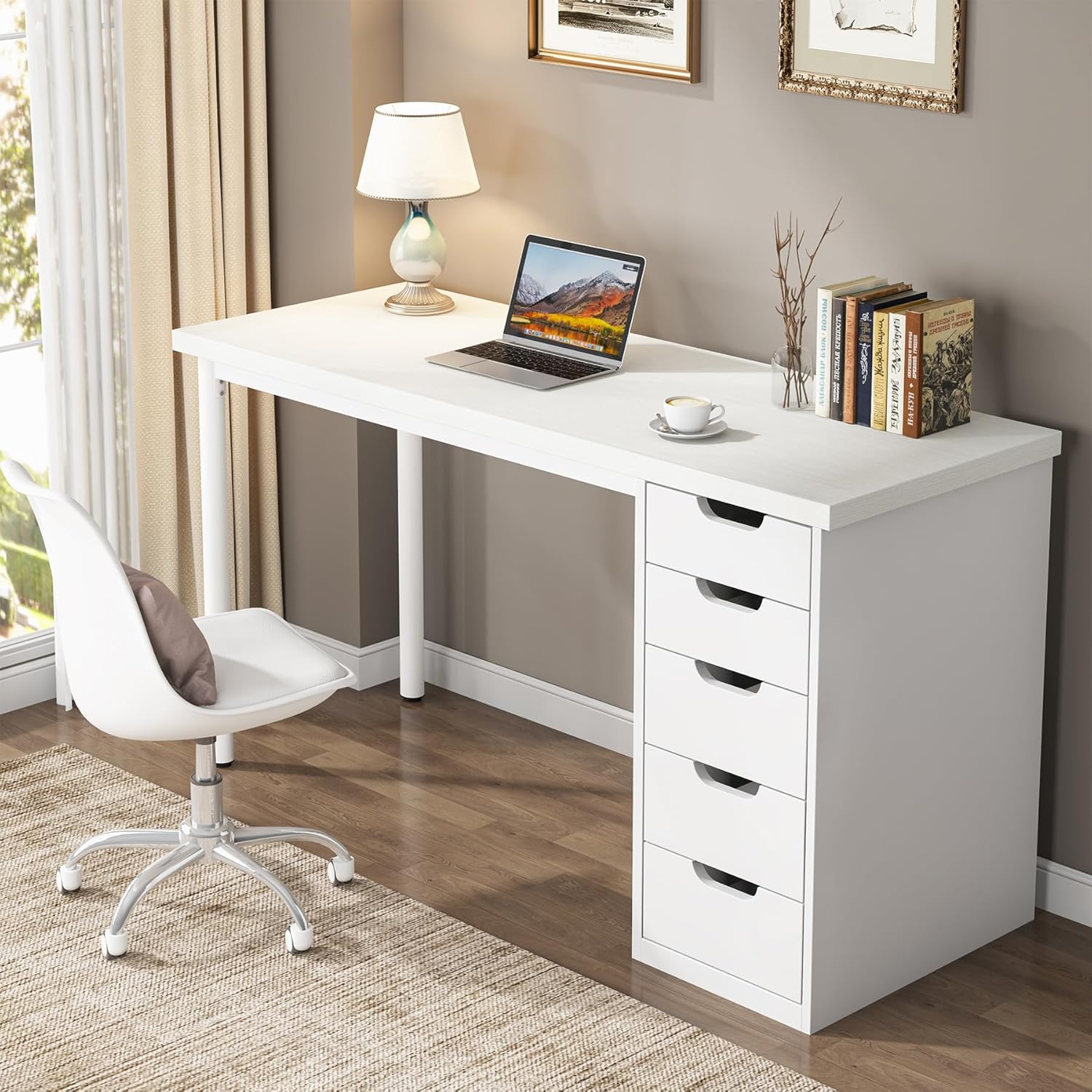 - Practical Storage Solution: Tribesigns Modern Simple Computer Desk is equipped with 5 deep drawers, providing plentiful storage space for organizing all your work essentials. Say goodbye to cluttered desktops, with ample room to store laptop, books, office supplies and paperwork. This practical storage solution ensures a cleaner, organized workspace, ultimately boosting productivity and offering peace of mind.