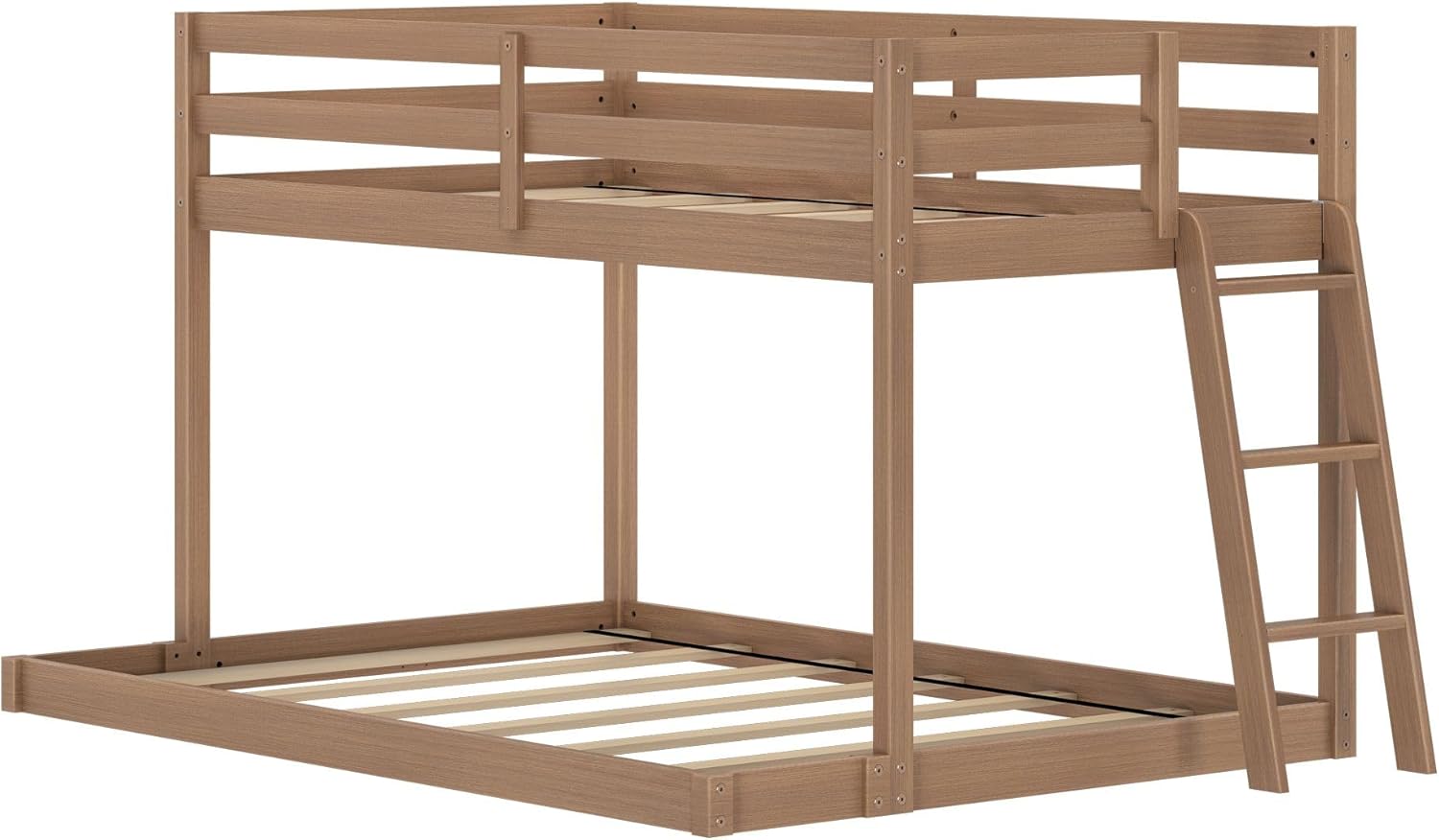 Grain & Grove Bear Twin Over Full Bunk Bed, Low Bunk Bed Frame for Kids, Bunk with Ladder, Guardrail, and Slats, No Box Spring Required, Oak Embossed Pecan