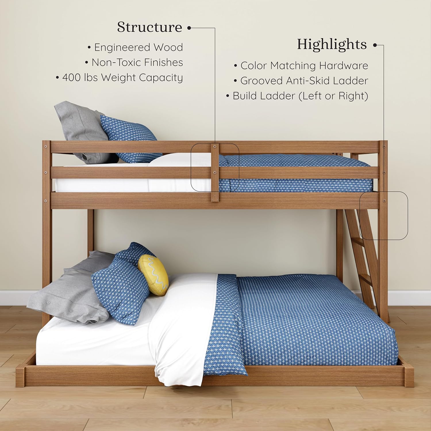 - Durable Build: Floor bunk bed is built with durable engineered wood and color-matched hardware to balance sturdy construction with sleek style. Each bunk has wooden slats and a metal support bar that contribute to a 400 lb. weight capacity per bed.