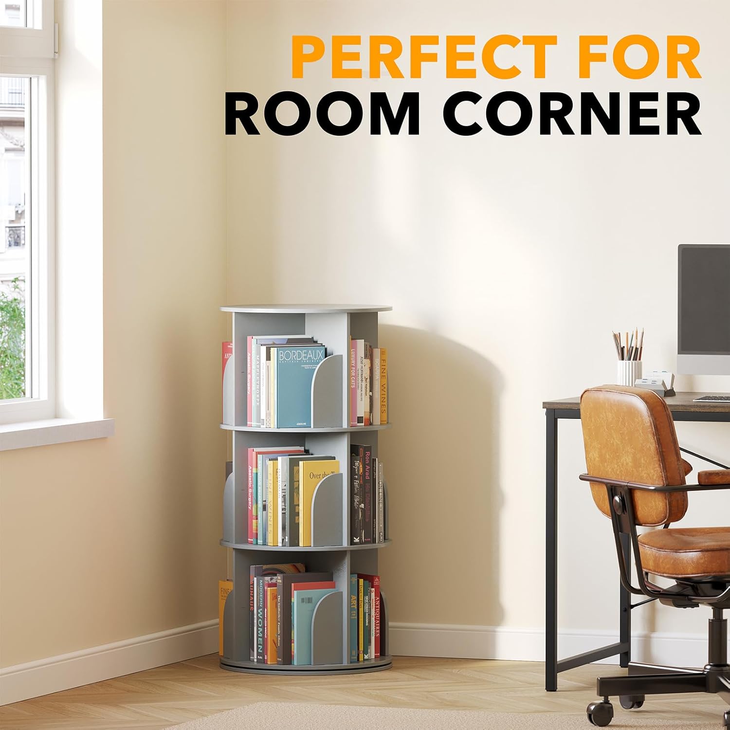 - 3-TIER GRAY BOOKSHELF DISPLAY - Keep your home clean and keep track of your books better with this spinning bookcase tower; Makes every book visible and save so much of your room book storage space