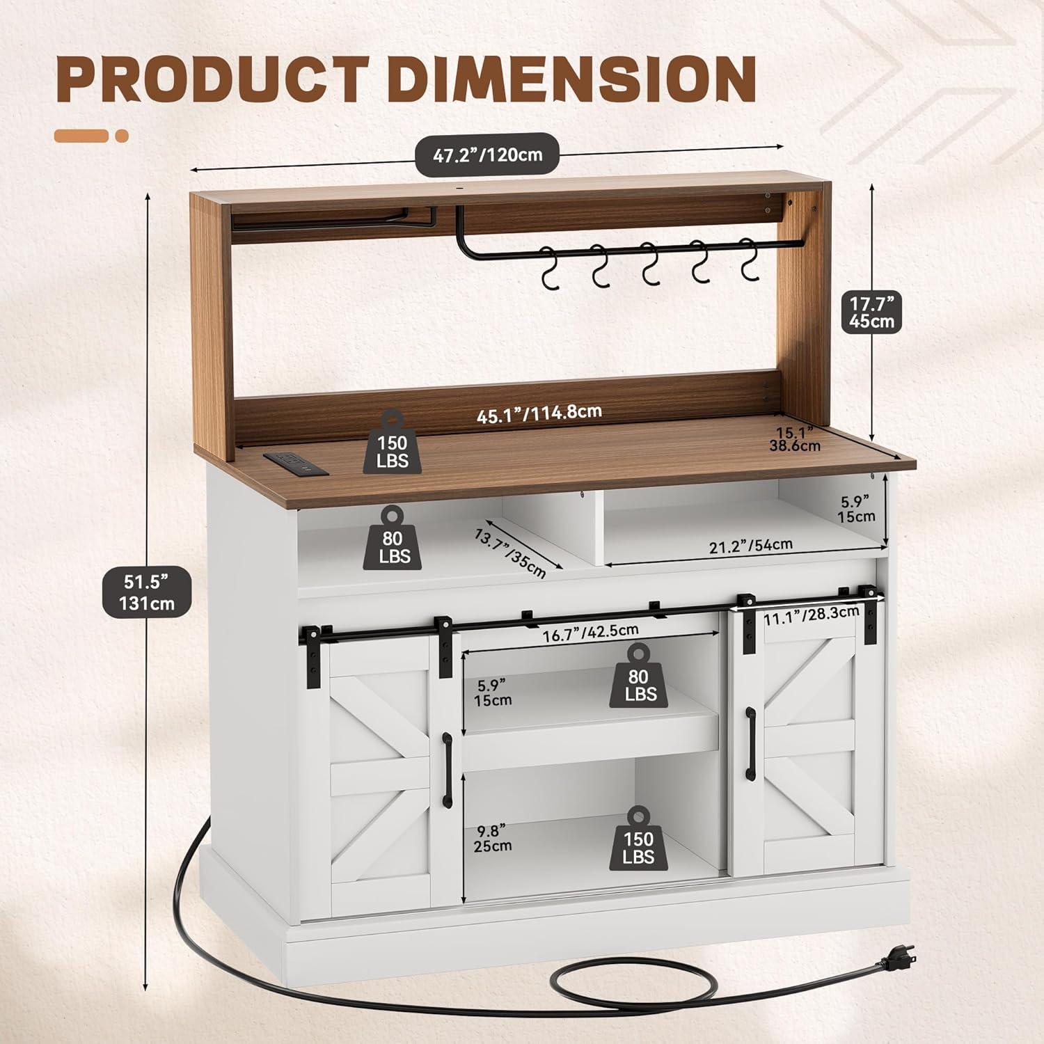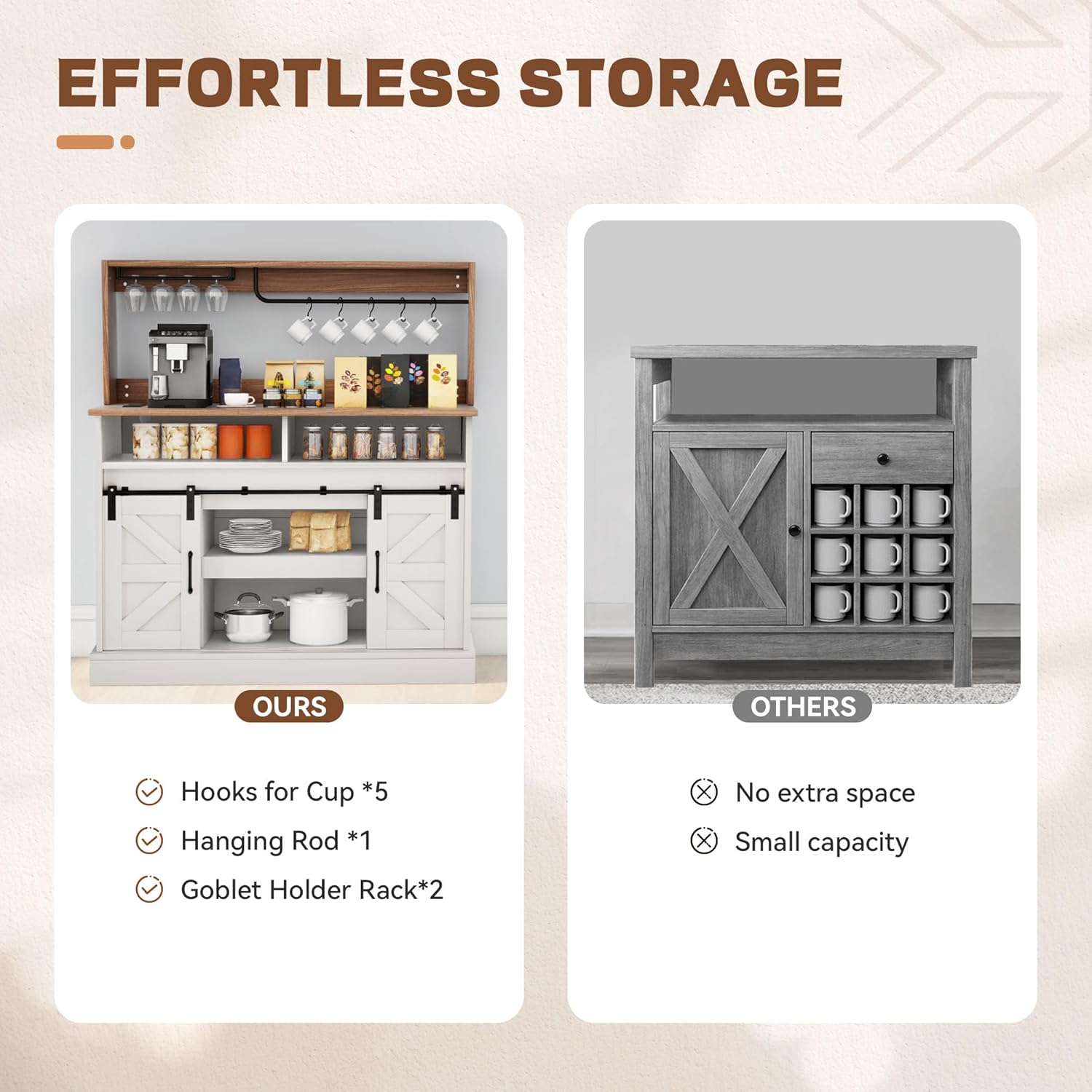YITAHOME 47" Coffee Bar with Goblet Holder & Power Outlet, Buffet Cabinets with Storage,Farmhouse Sideboard Cabinets with Sliding Barn Doors for Kitchen, Living Room (White)