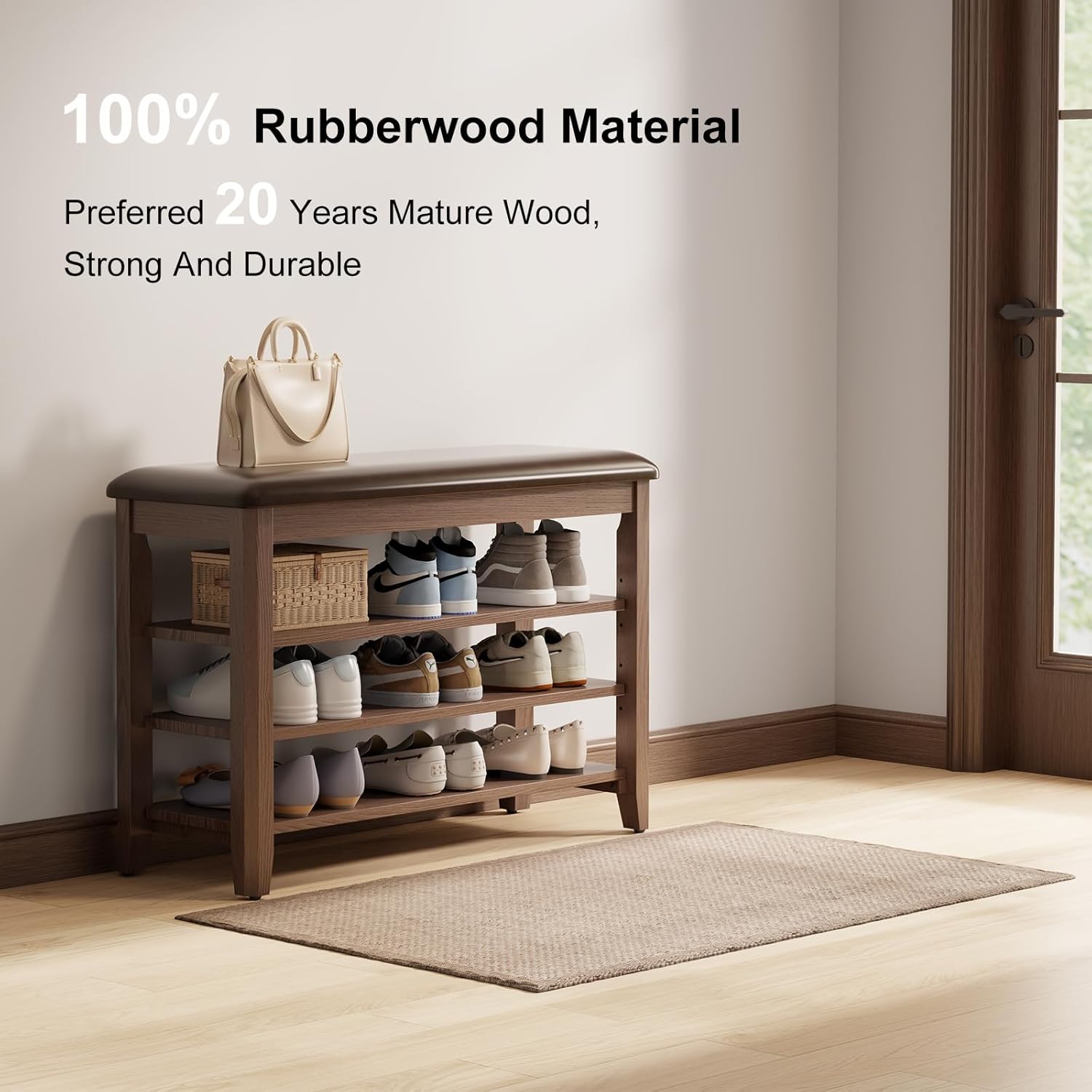 Shoe Bench with Leather Cushion, 3 Tiers Shoe Storage Bench Height Adjustable, Walnut Wood Entryway Bench for Hallway, Mudroom