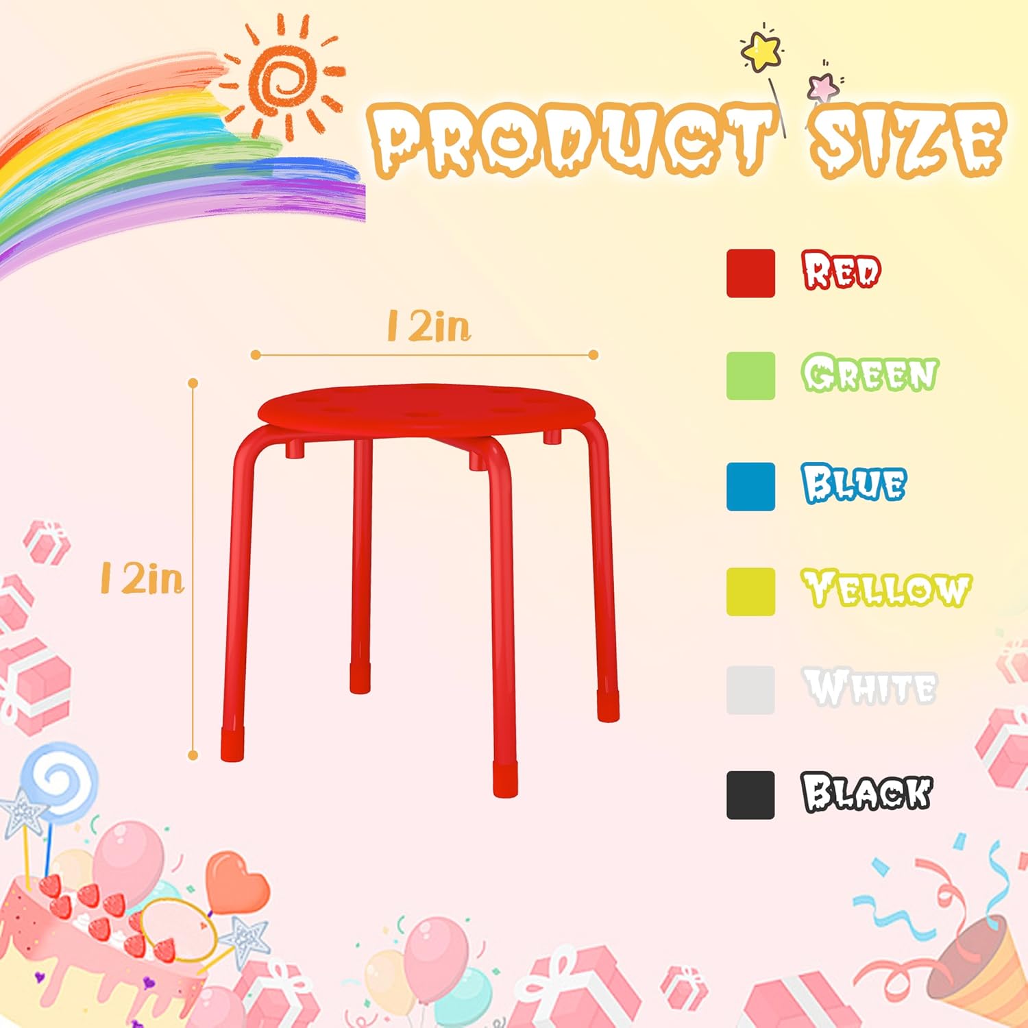 - Versatile Seating Solution: Set of 6 stackable stools is perfect for various settings, including classrooms, daycare, homes, and event venues. Their compact design provides convenient extra seating whenever needed, while the stackable feature ensures easy storage when not in use. The fun assortment of colors: red, blue, yellow, green, white and black, adds a vibrant touch to any space.