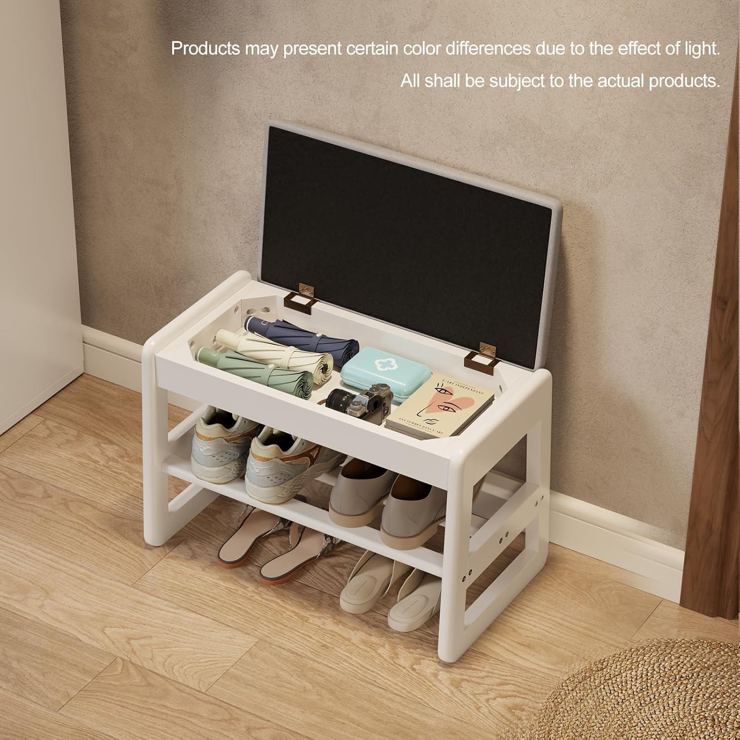 Small Shoe Bench with Cushion,2 Tiers Shoe Rack Bench with Flip-Top Storage,Wood Shoe Rack for Entryway(White,23.62")