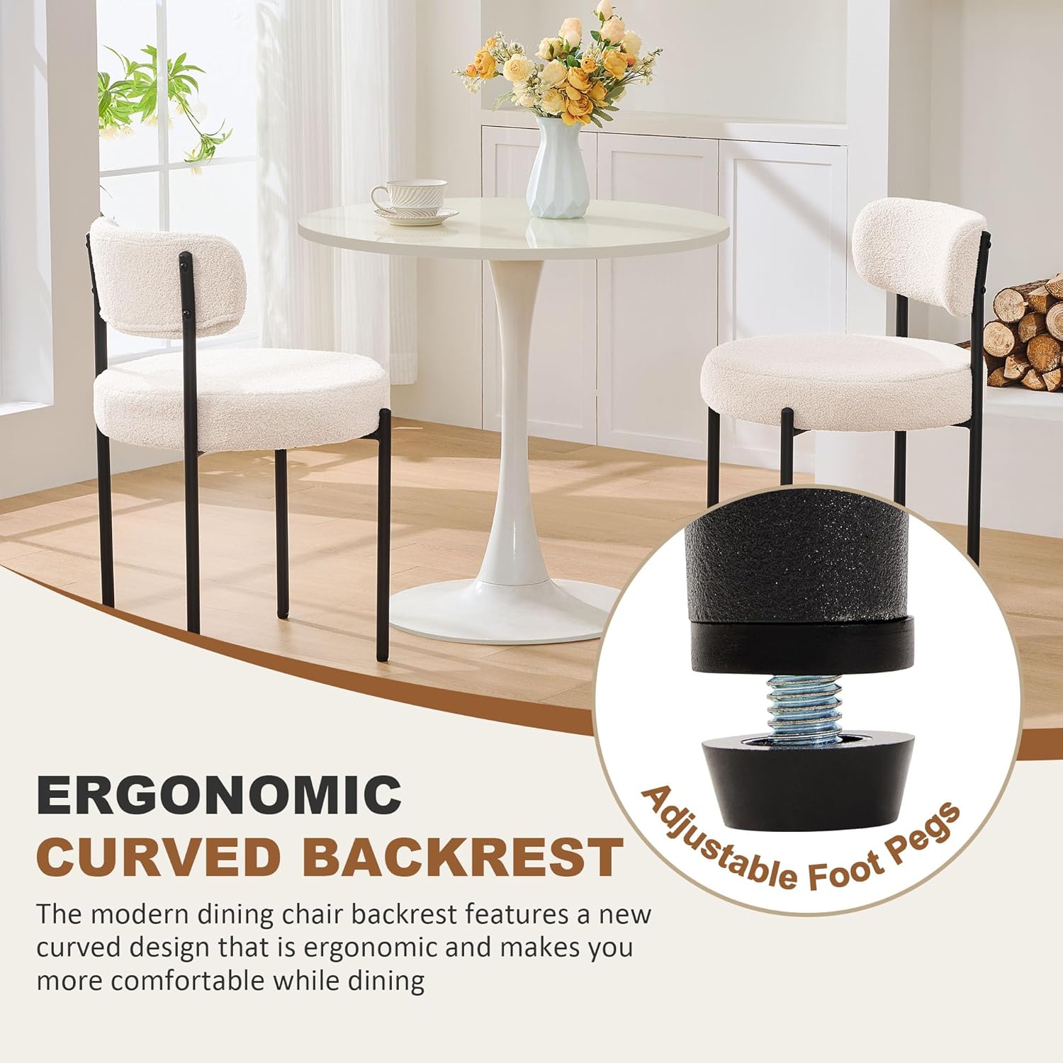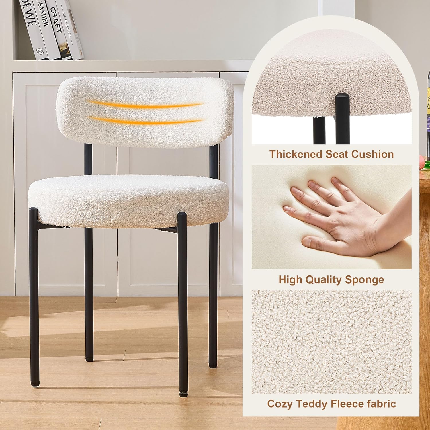 Dining Chairs Set of 4, White Boucle Dining Chair, Curved Backrest Upholstered Dining Room Chairs with Black Metal Legs, Mid Century Modern Dining Chairs for Kitchen, Living Room, White