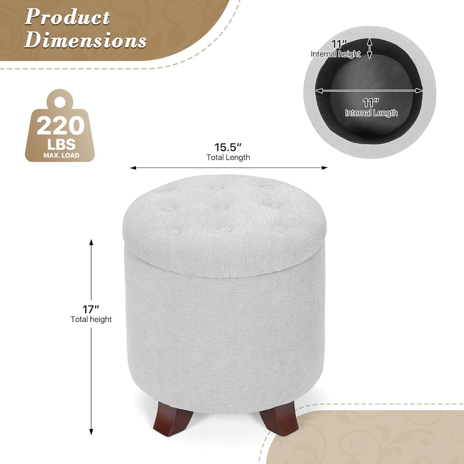 Athena Collection 15 Inch Small Ottoman with Storage, Round Linen Fabric Storage Ottoman Foot Rest with Removable Lid, Multipurpose Footstool Footrest for Living Room, Bedroom, Dorm, Grey