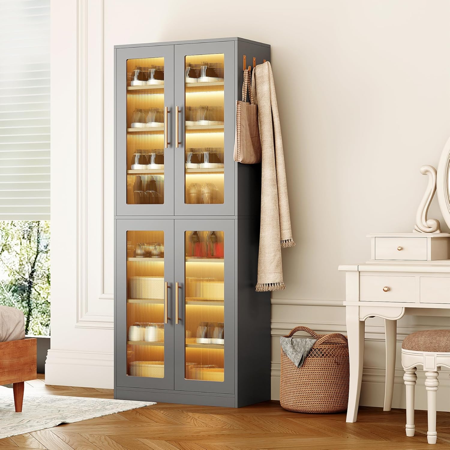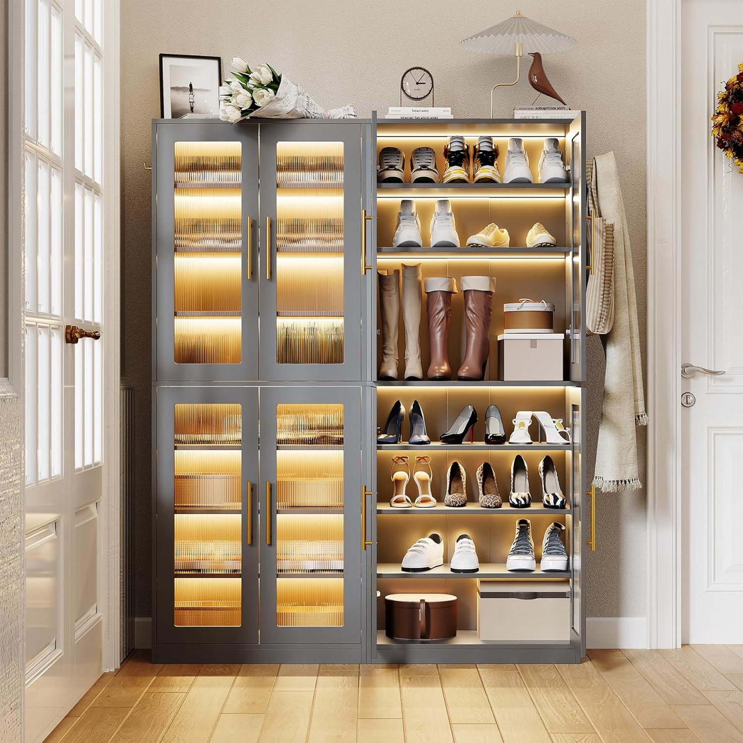 LITTLE TREE Stylish 8-Tier Vertical Shoe Rack with Built-in LED Lighting, Doors for Dust Protection, and Convenient External Hooks, Shoe Cabinet for Entryway, Living Room, Bedroom, Grey
