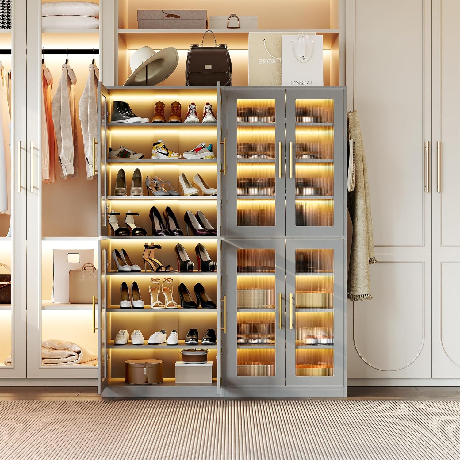 - Built-In LED Strip: Designed with built-in LED lighting and available in a variety of colors, this shoe rack not only adds an elegant touch to your space, but also makes it easier to quickly find your beloved shoes