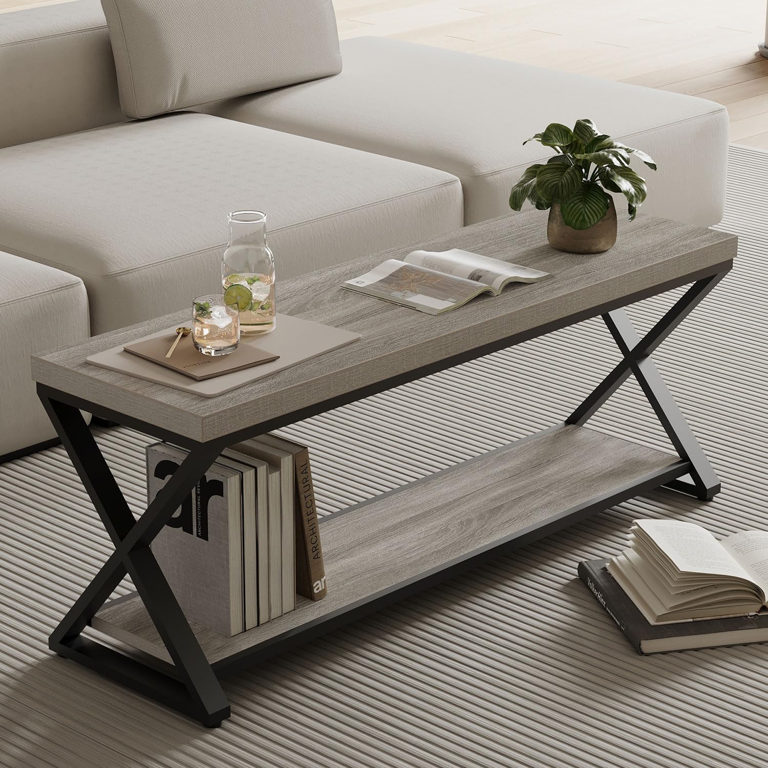 IBF Industrial Wood Entryway Bench, Indoor Farmhouse Hallway Accent Entry Bench for Seating Sitting with Storage, Metal Shoe Rack Grey Bench Organizer in Foyer Bedroom, Light Grey Oak, 47 Inch Long