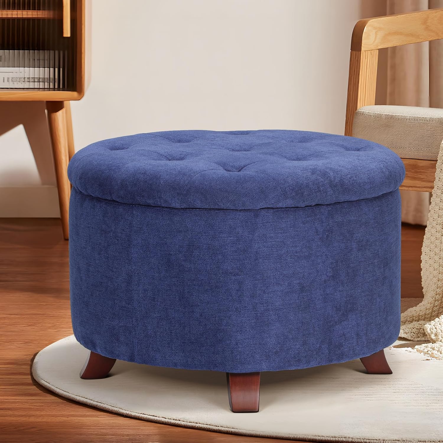 - Chic Storage Solution: Enhance your space with this round ottoman, crafted with premium fabric and dark walnut-finished legs. It serves as both a stylish storage option and a comfy footrest, effortlessly complementing your home decor.