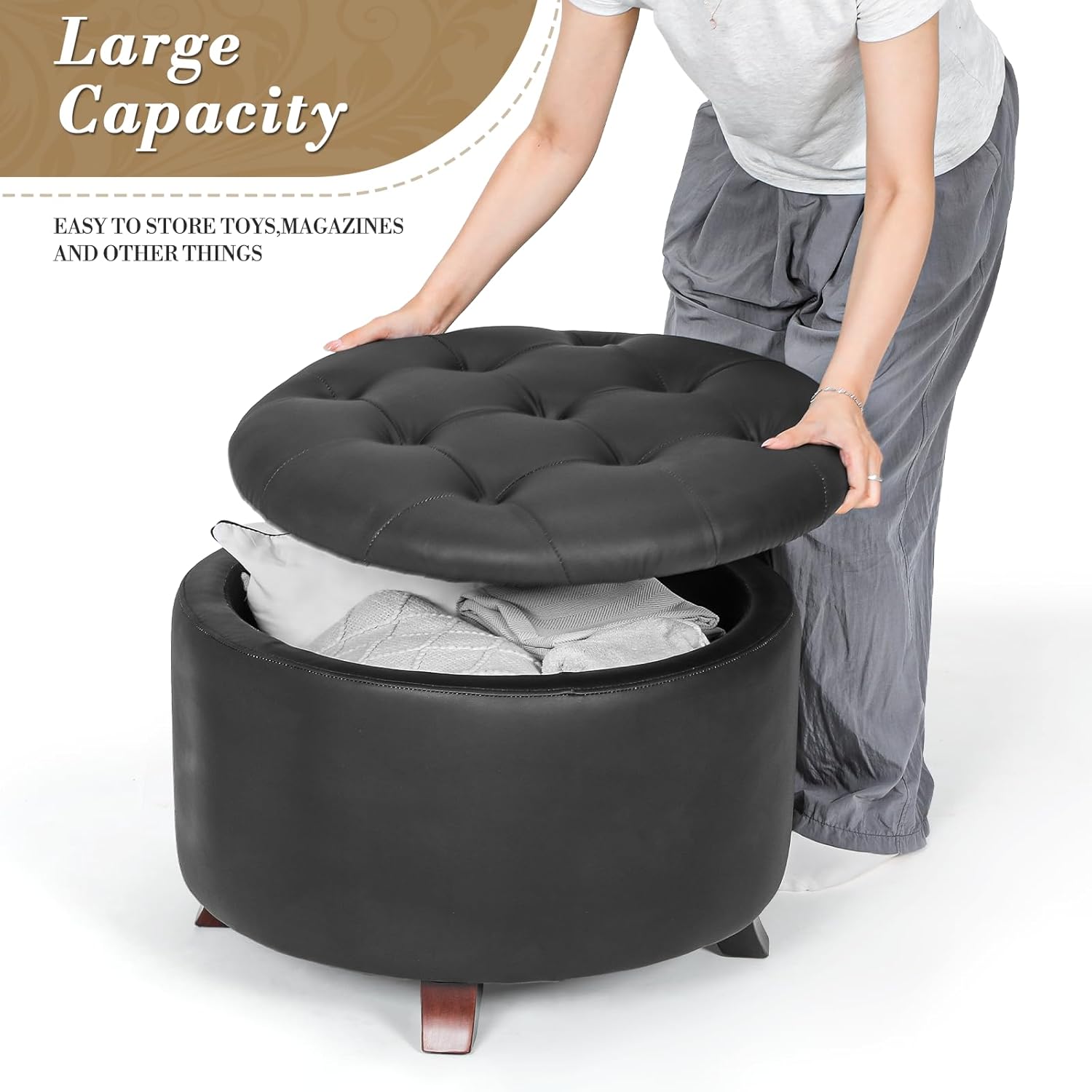 Athena Collection 24.5 Inch Small Ottoman with Storage, Round PU Leather Storage Ottoman Foot Rest with Removable Lid, Multipurpose Footstool Footrest for Livingroom, Bedroom, Dorm, Black
