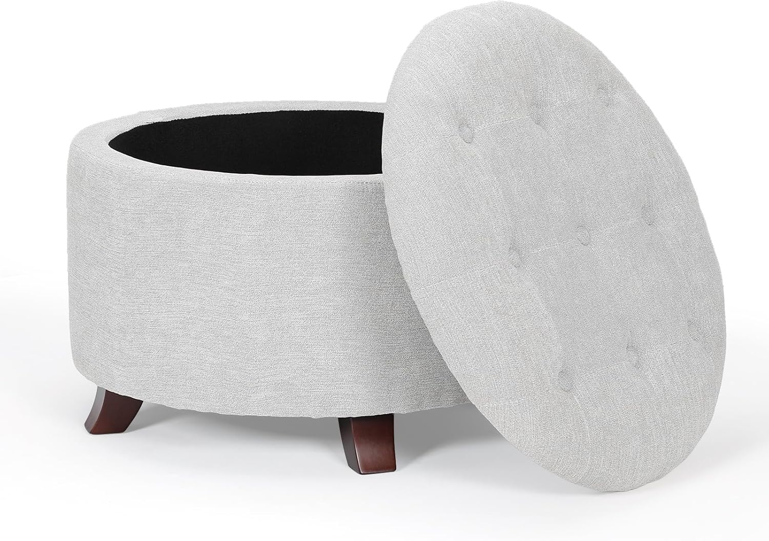 - Chic Storage Solution: Enhance your space with this round ottoman, crafted with premium fabric and dark walnut-finished legs. It serves as both a stylish storage option and a comfy footrest, effortlessly complementing your home decor.