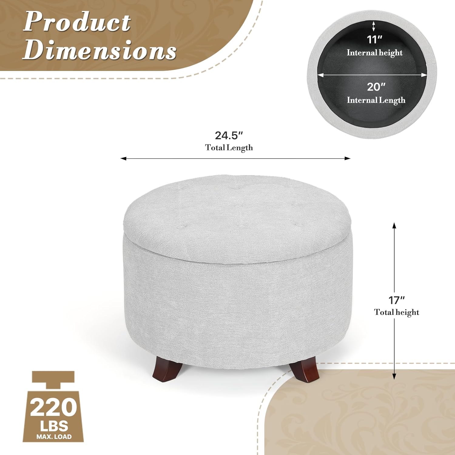 Athena Collection 24.5 Inch Small Ottoman with Storage, Round Linen Fabric Storage Ottoman Foot Rest with Removable Lid, Multipurpose Footstool Footrest for Livingroom, Bedroom, Dorm, Grey