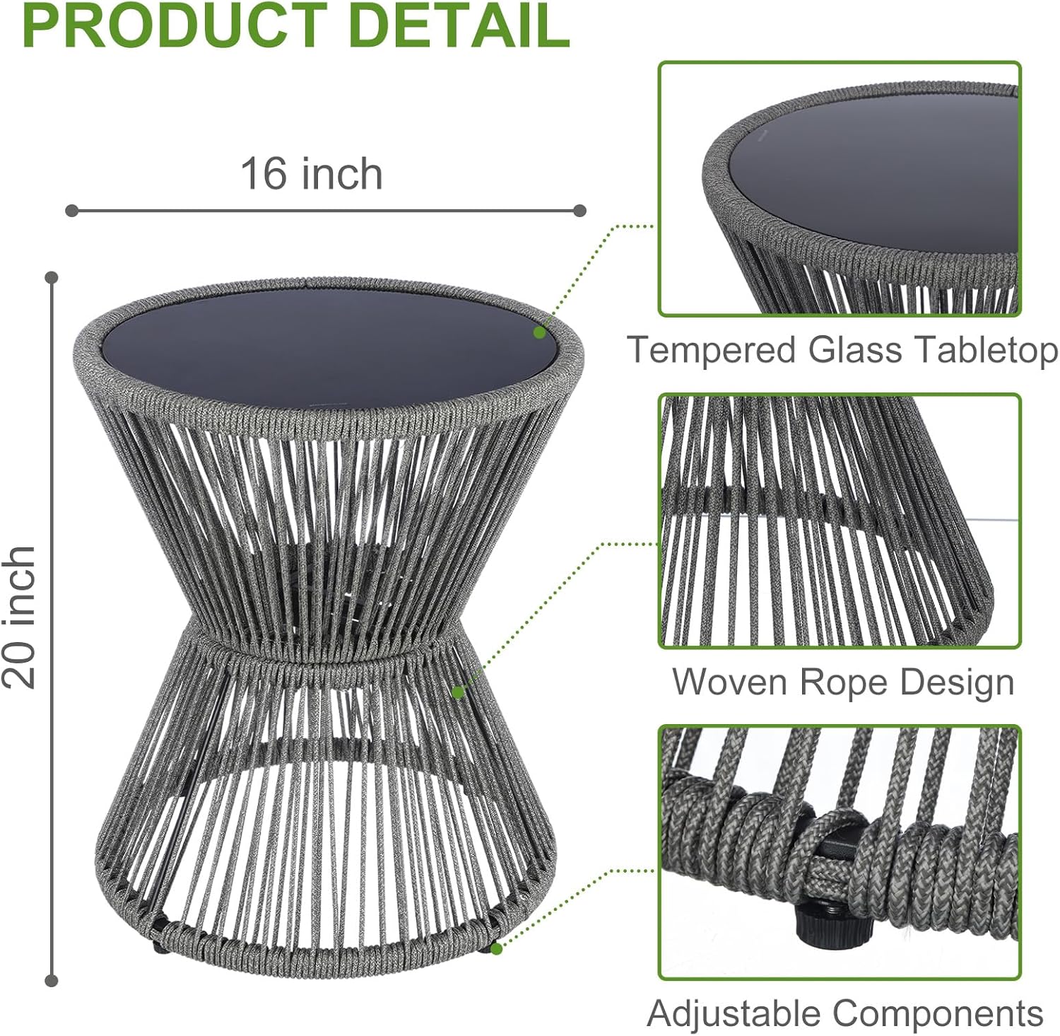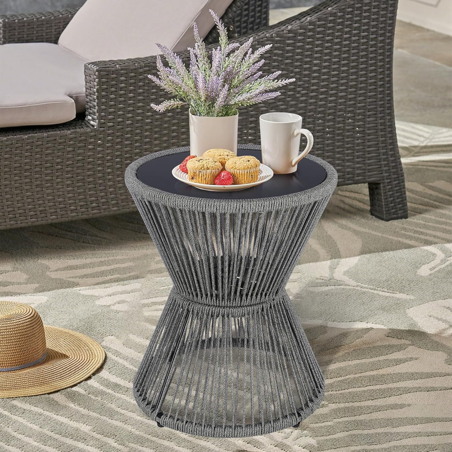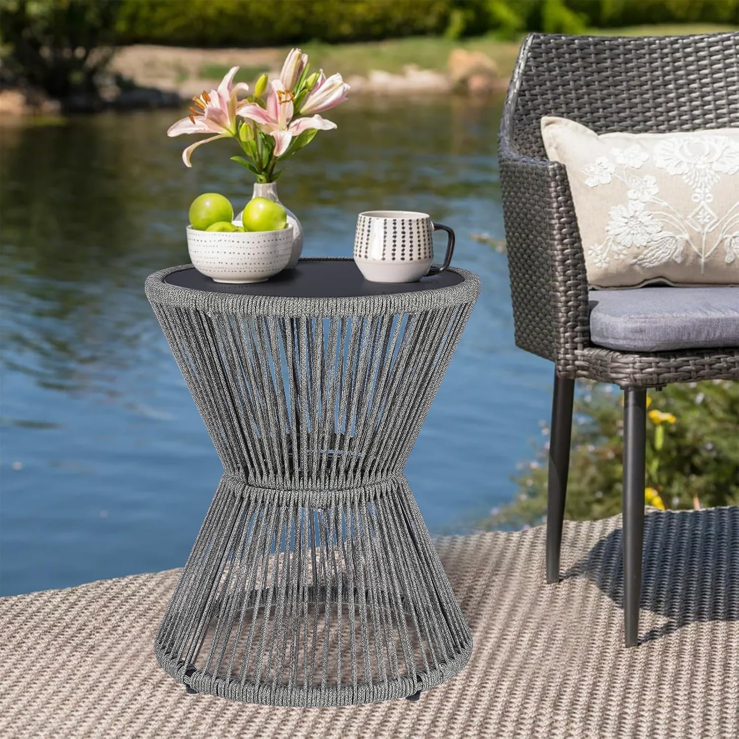 LEWIS&WAYNE Small Outdoor Side Table Patio 20’’ H Woven Rope Hourglass End Table with Glass Top Round Coffee Table for Living Room Outdoor Patio Backyard Poolside (Gray)