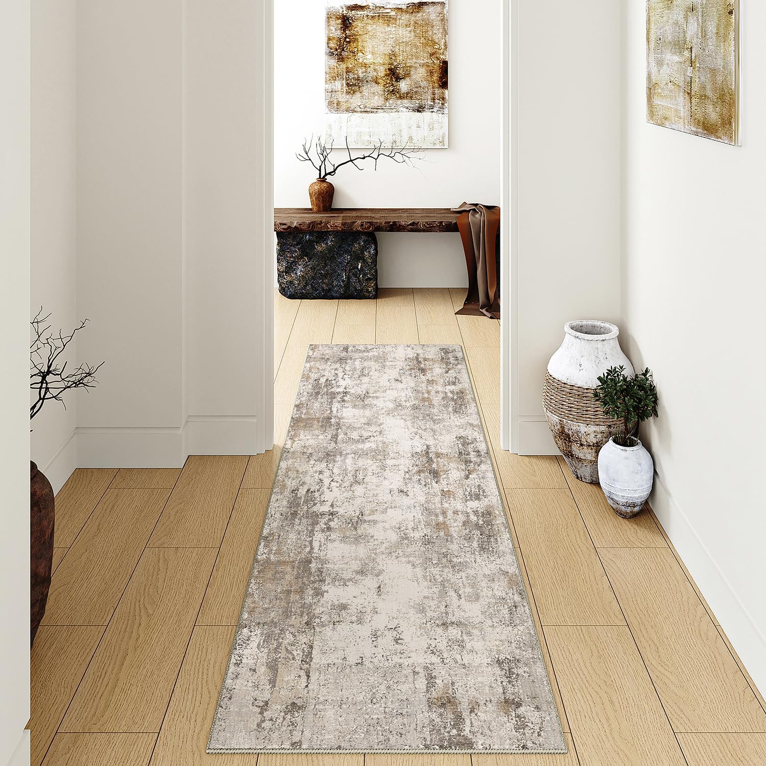 2x12 Washable Runner Rug Brown Grey Neutral Abstract Hallway Kitchen Living Room Bedroom Non Slip Throw Rug Soft Low Pile Indoor Carpet for Entrance Laundry Bathroom