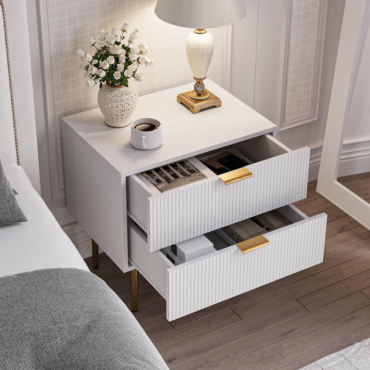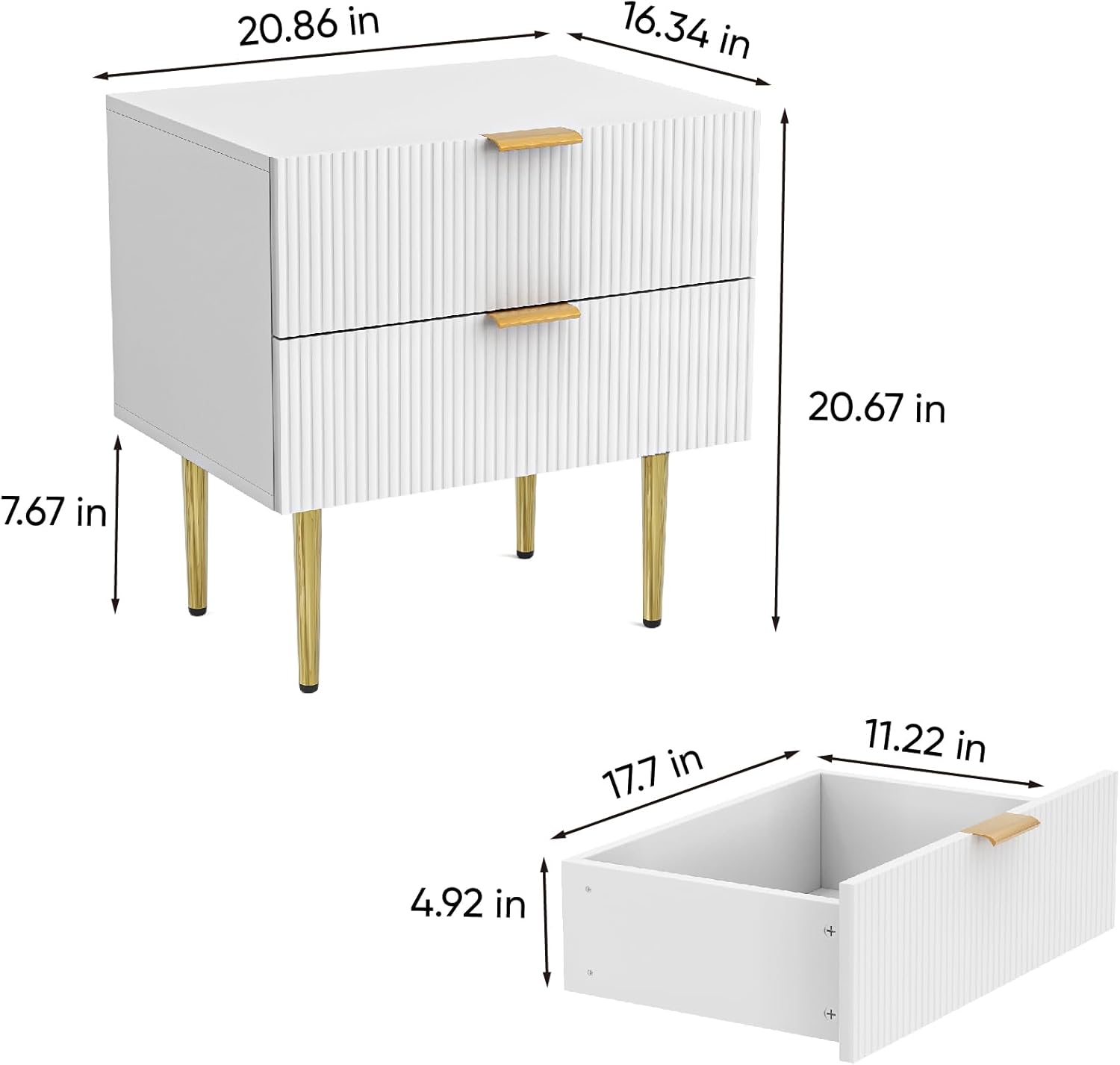 White Nightstand for Bedroom, Fluted Night Stand Set of 2, Mid Century Modern Bedside Table with Gold Metal Legs