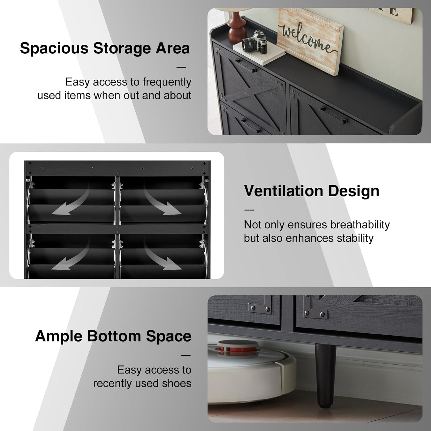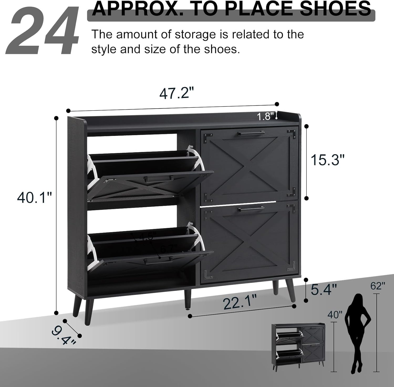 Shoe Storage Cabinet,Farmhouse Shoe Organizer with 4 Flip Drawers & Barn Door Design,Freestanding Hidden Slim Narrow Shoe Rack Cabinet for Entryway,Foyer,Hallway,Black