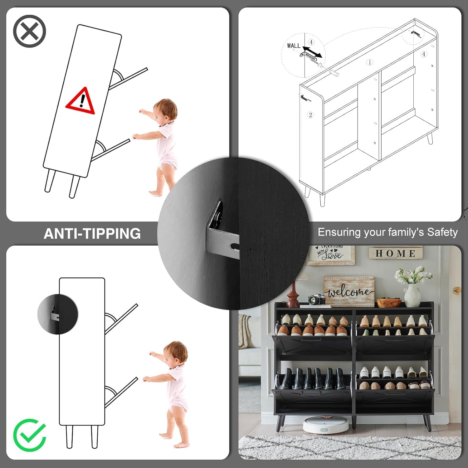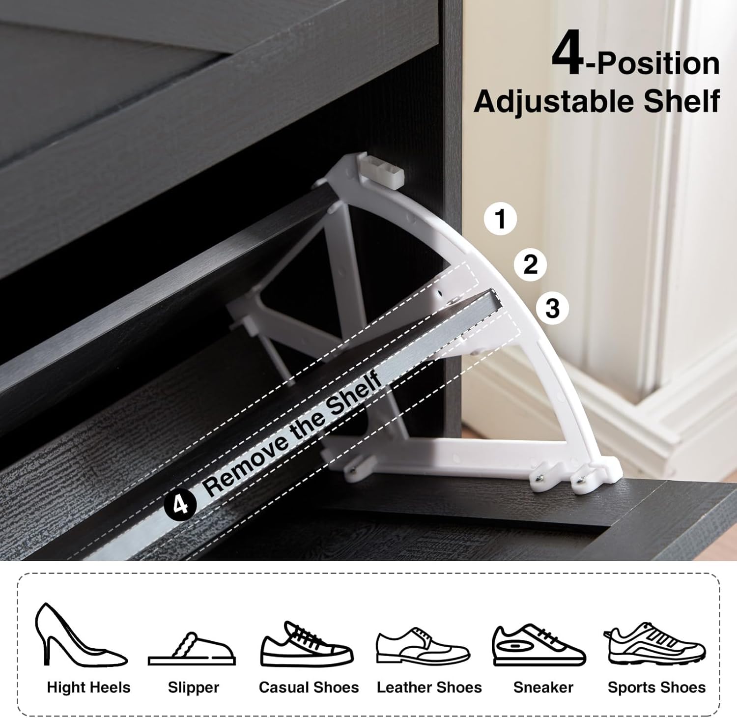 - 【Farewell to Shoe Piles】Keeps shoes handy but out of sight. Our shoe storage cabinet can accommodate a family's shoes.Four flip drawers and each with two layers. Need storage for ankle boots and high heels? You can easily adjust the space in the shoe compartments by moving or taking away the dividers.