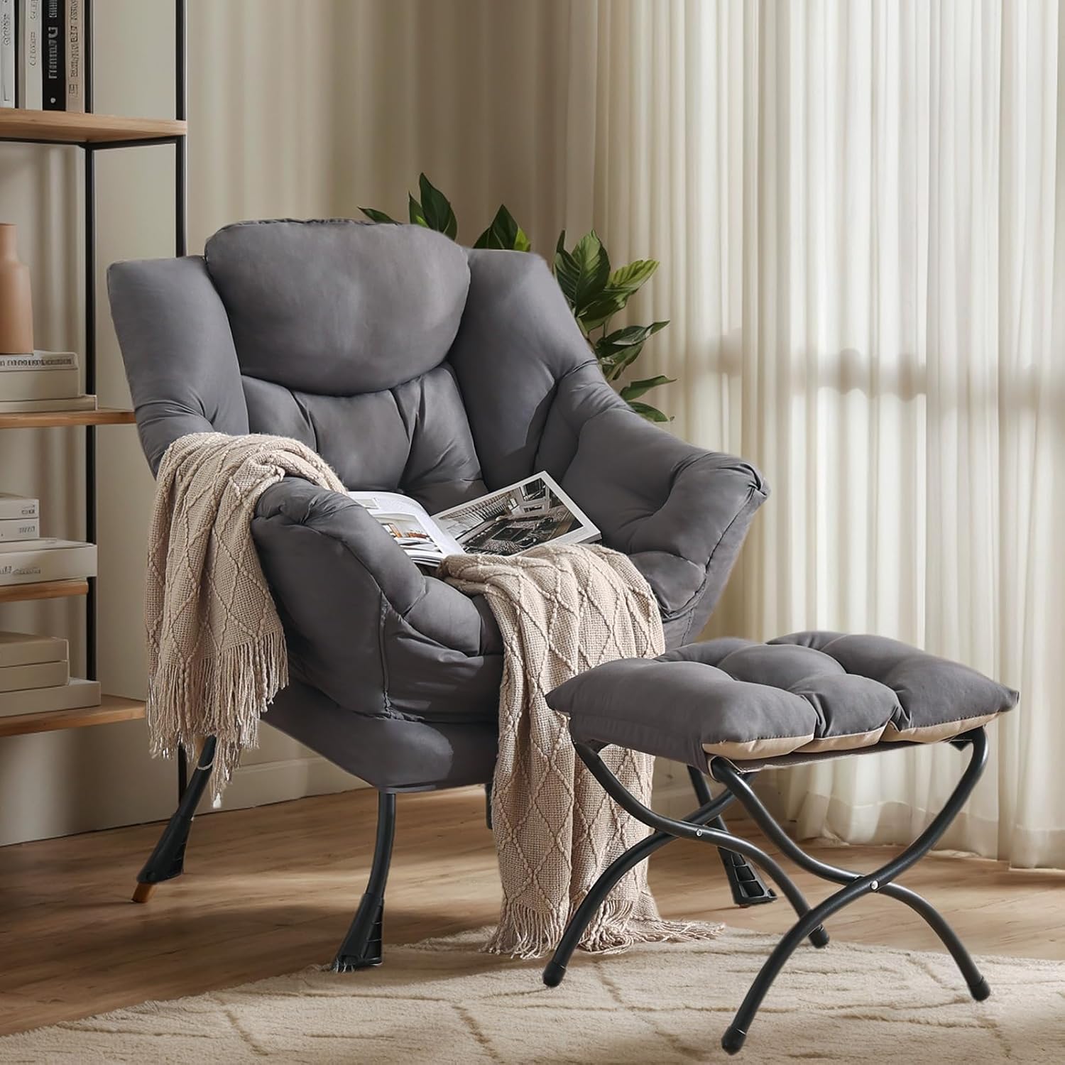 Lazy Chair with Ottoman, Reading Armchair with Armrests and Footrest, Large Modern Lounge Accent Chair with Ottoman, Leisure Sofa Chair for Living Room, Bedroom, Dorm Room (Dark Grey)